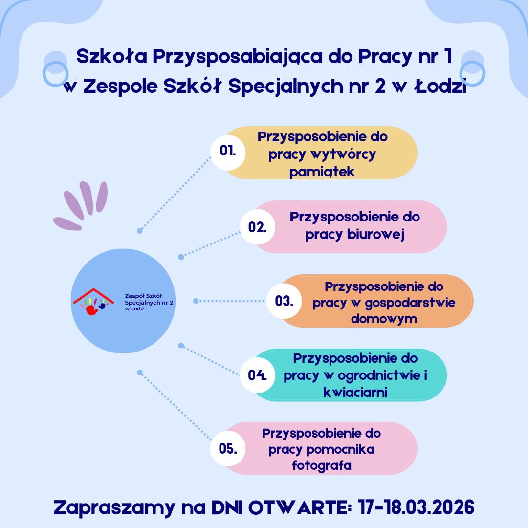 Zapraszamy rodziców i opiekunów uczniów Szkoły Przysposabiającej do Pracy na I Targi Pracy 22 stycznia br. przed zebraniami z wychowawcami w godz. 16.15-17.00. Zaproszenie w załączniku. Wydarzeniu Patronuje Pani Katarzyna Tręda-Pisera - Rzecznik Osób z Niepełnosprawnościami w Łodzi.