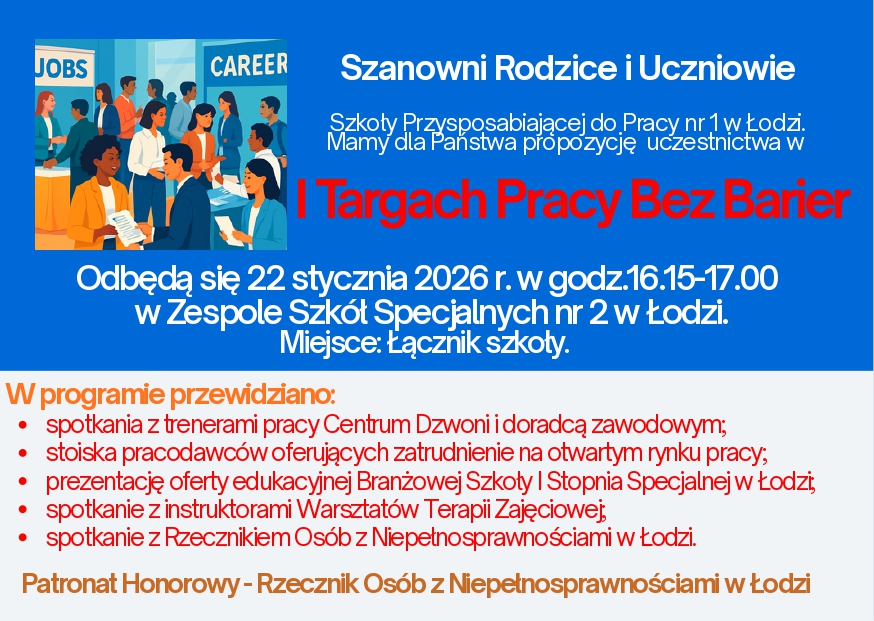 Zapraszamy rodziców i opiekunów uczniów Szkoły Przysposabiającej do Pracy na I Targi Pracy 22 stycznia br. przed zebraniami z wychowawcami w godz. 16.15-17.00. Zaproszenie w załączniku. Wydarzeniu Patronuje Pani Katarzyna Tręda-Pisera - Rzecznik Osób z Niepełnosprawnościami w Łodzi.