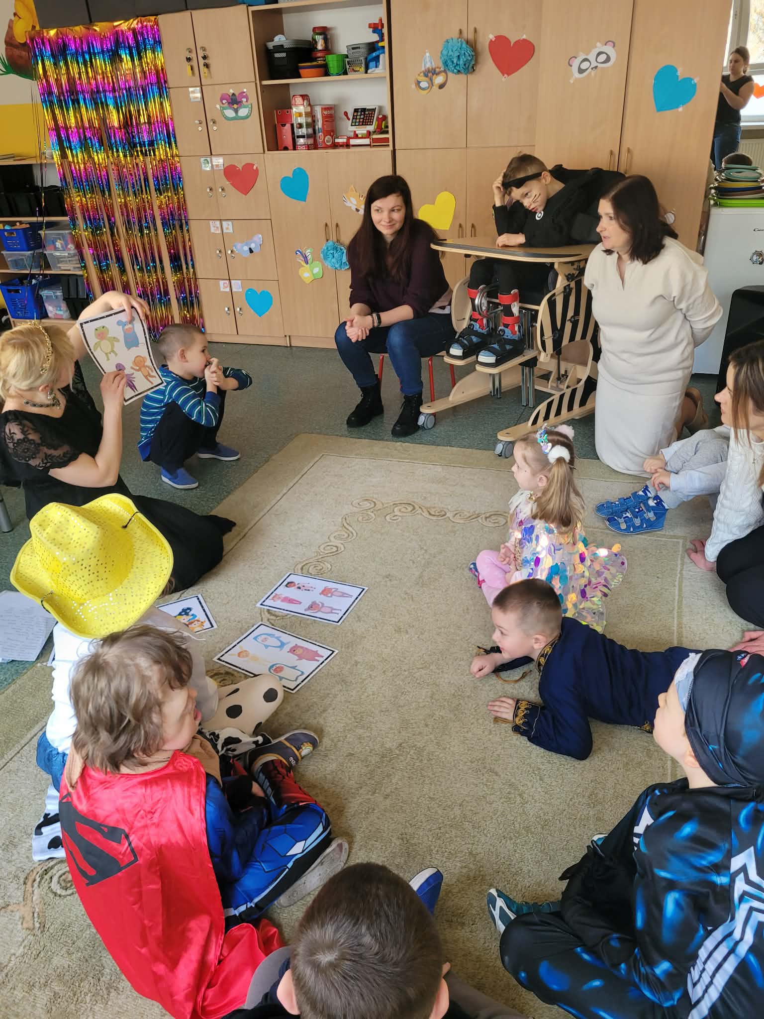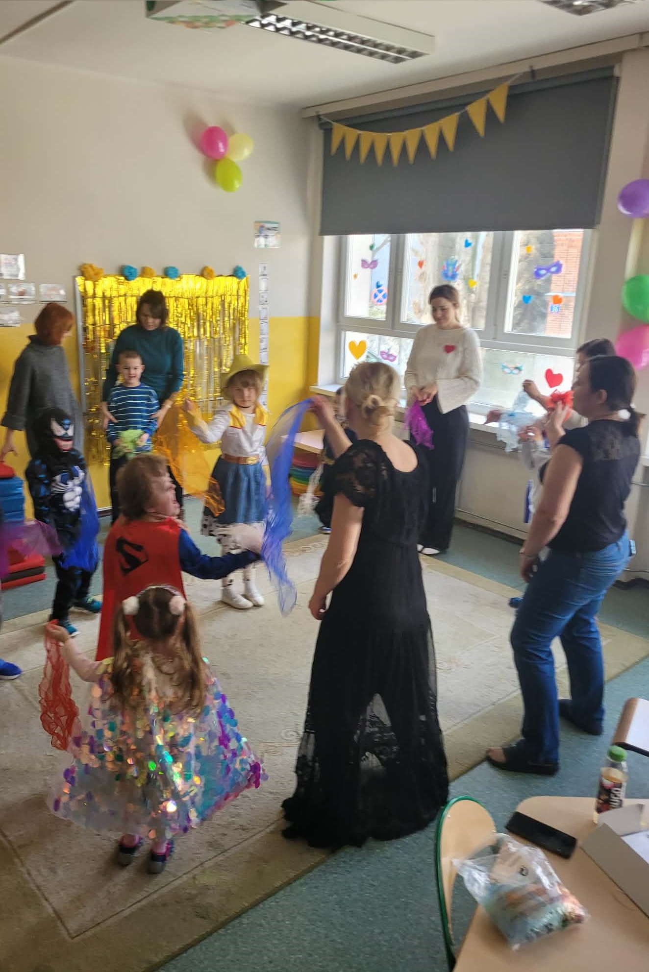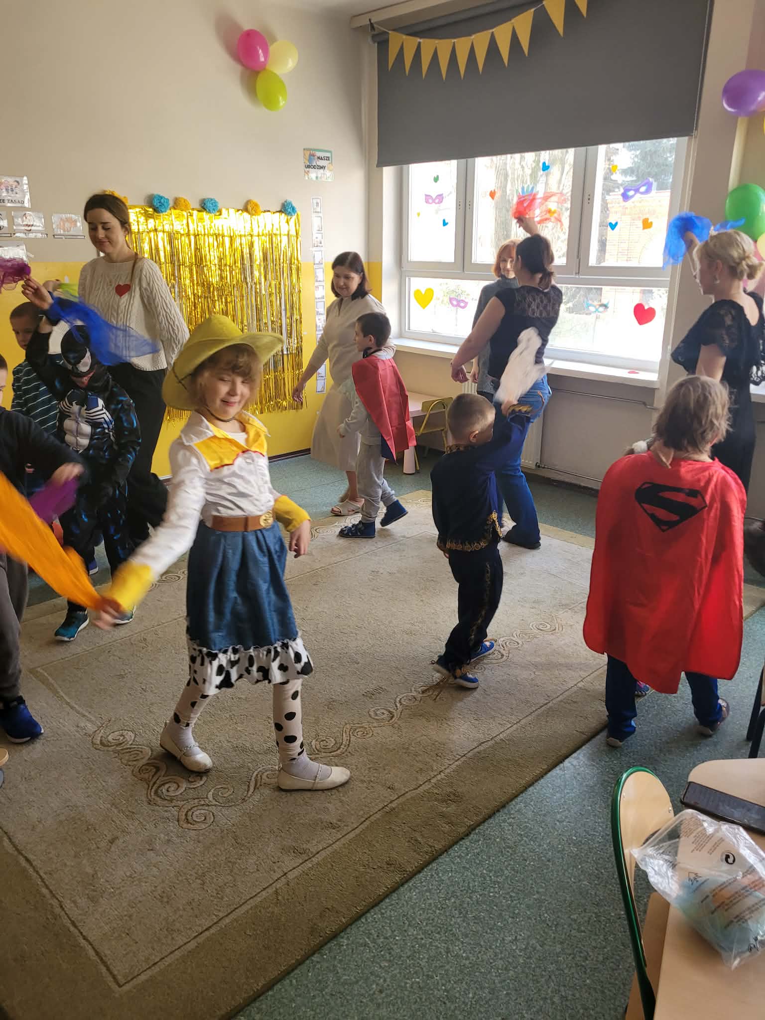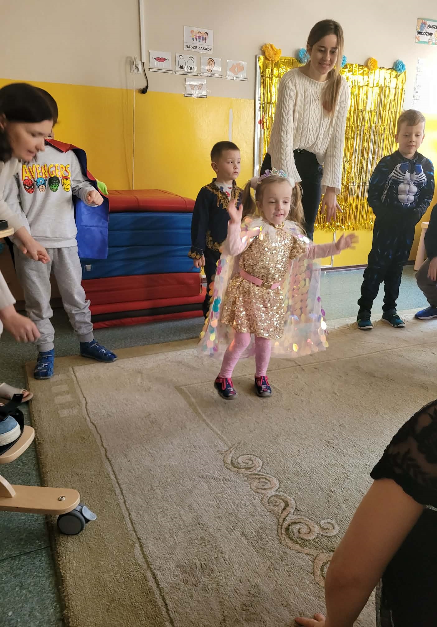 Dzieci bawiły się w rytm wesołej muzyki, uczestniczyły w tańcach oraz różnorodnych zabawach ruchowych. Nie zabrakło także ćwiczeń rozwijających koordynację, sprawność i współpracę w grupie. Wszystko odbywało się w atmosferze radości, a wymyślne stroje dodawały wydarzeniu wyjątkowego uroku.