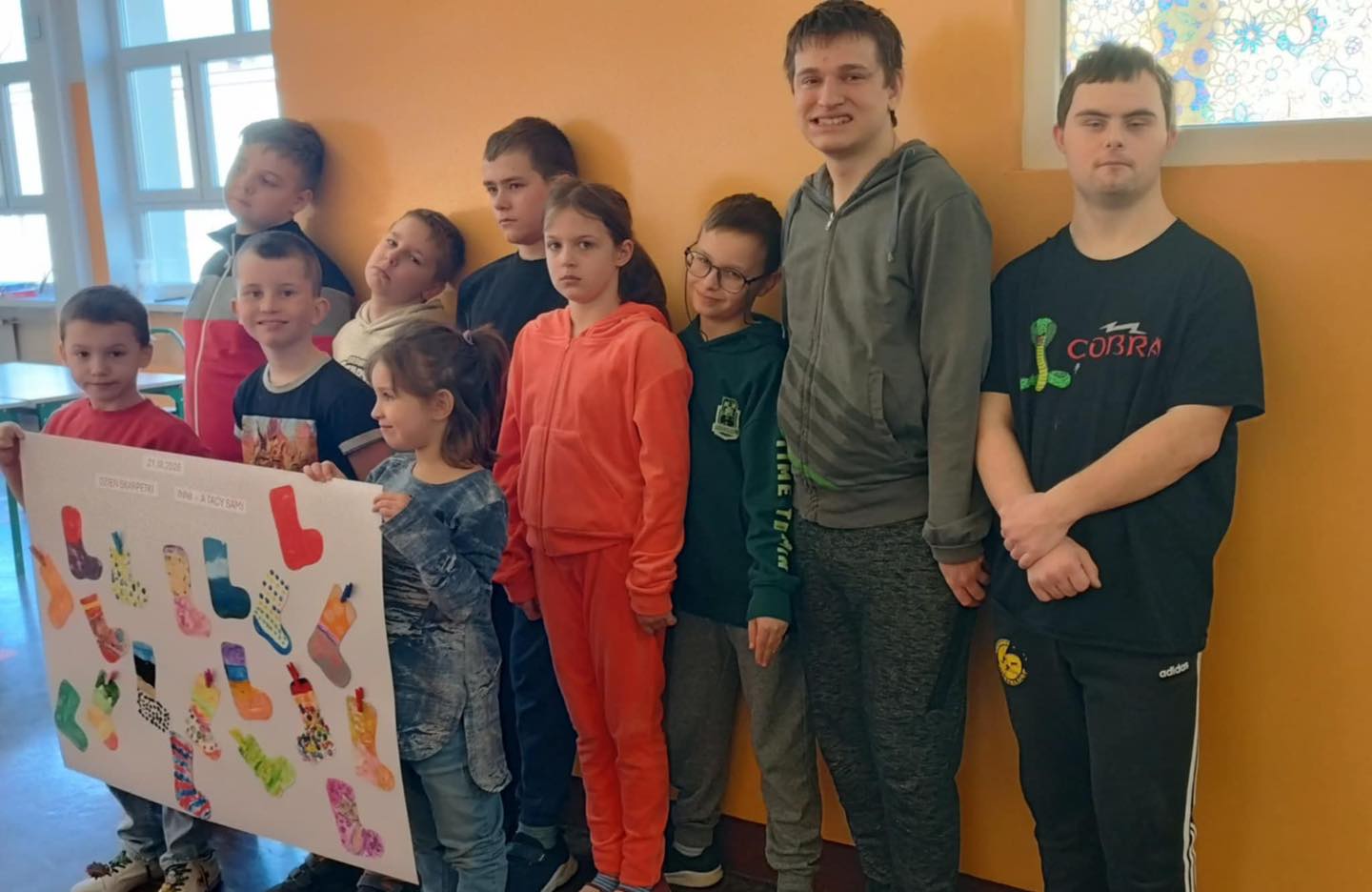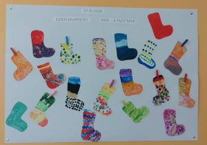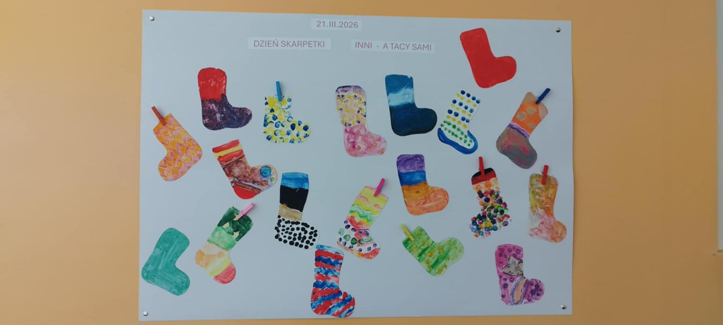 Światowy Dzień Osób z Zespołem Downa obchodzimy 21 marca. Z tej okazji młodsi uczniowie już dzisiaj wykonali wspaniałą pracę plastyczną, wykorzystując kolorowe skarpetki. Stworzyli intrygujące dzieło, które symbolizuje ich szacunek do wszystkich dotkniętych tą wrodzoną wadą genetyczną.