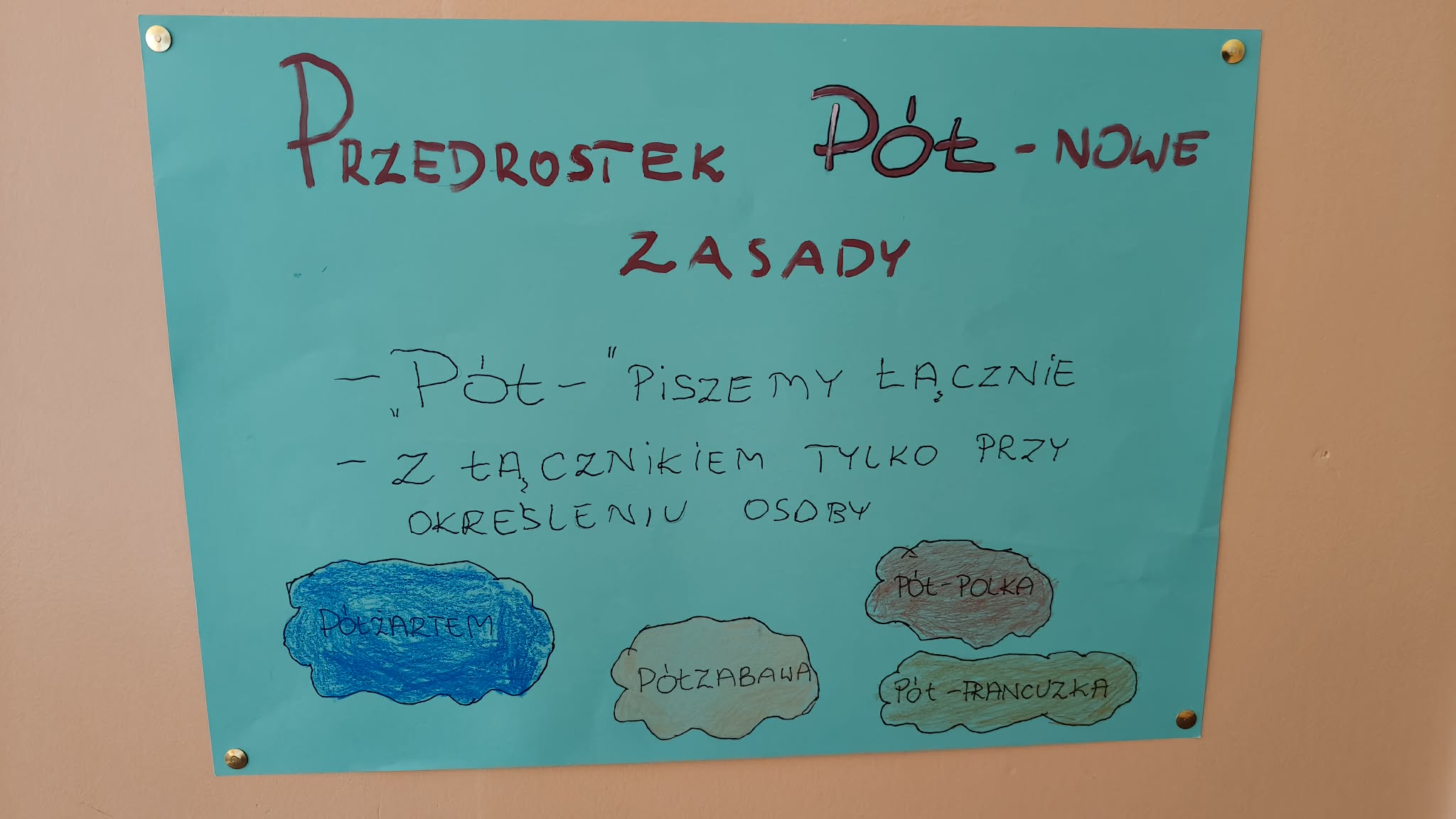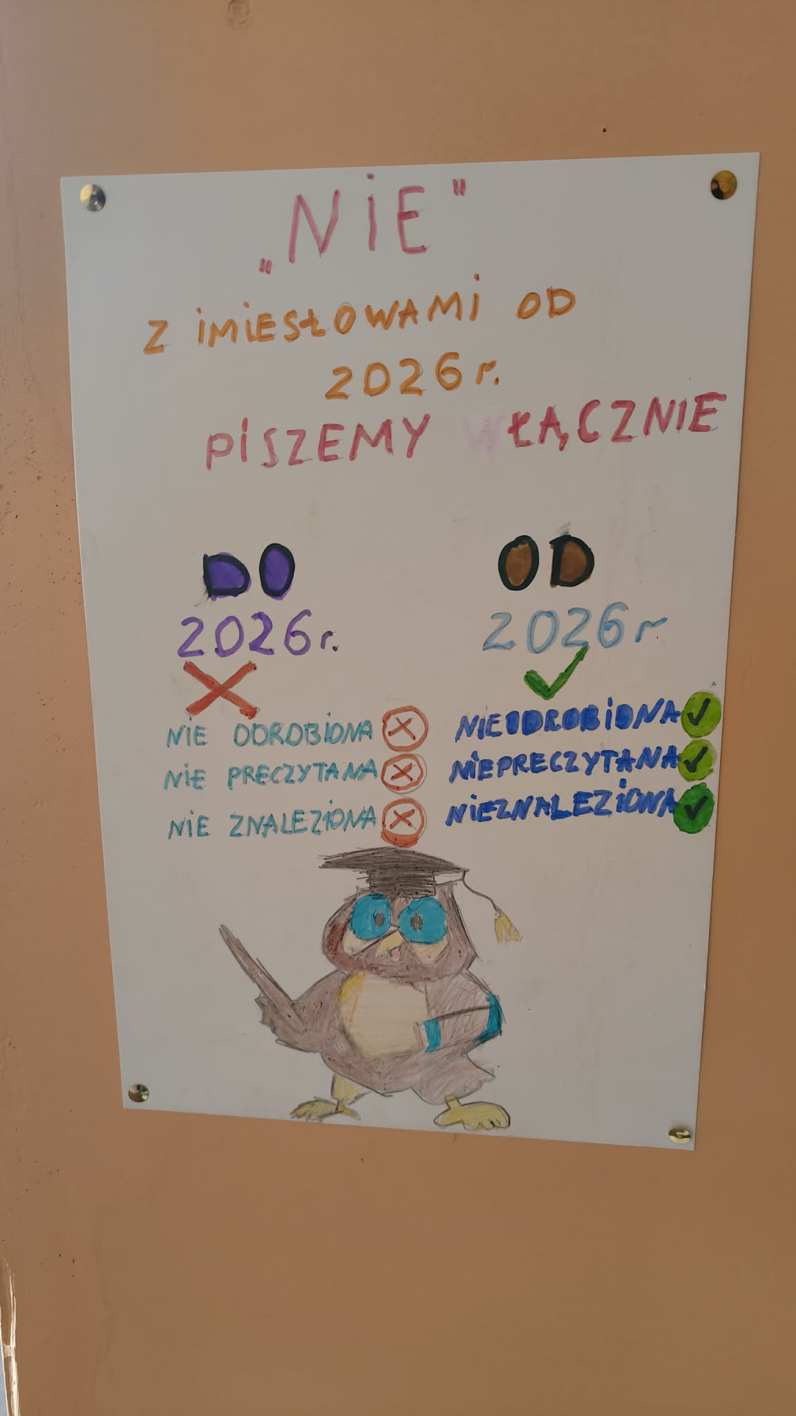 Efektem pracy naszych podopiecznych są plakaty, w przystępny sposób prezentujące większość nowych reguł. Zostały już one wyeksponowane na korytarzu szkolnym. Oby pomogły wszystkim zapamiętać zmiany i pisać zgodnie z aktualnie obowiązującymi zasadami.