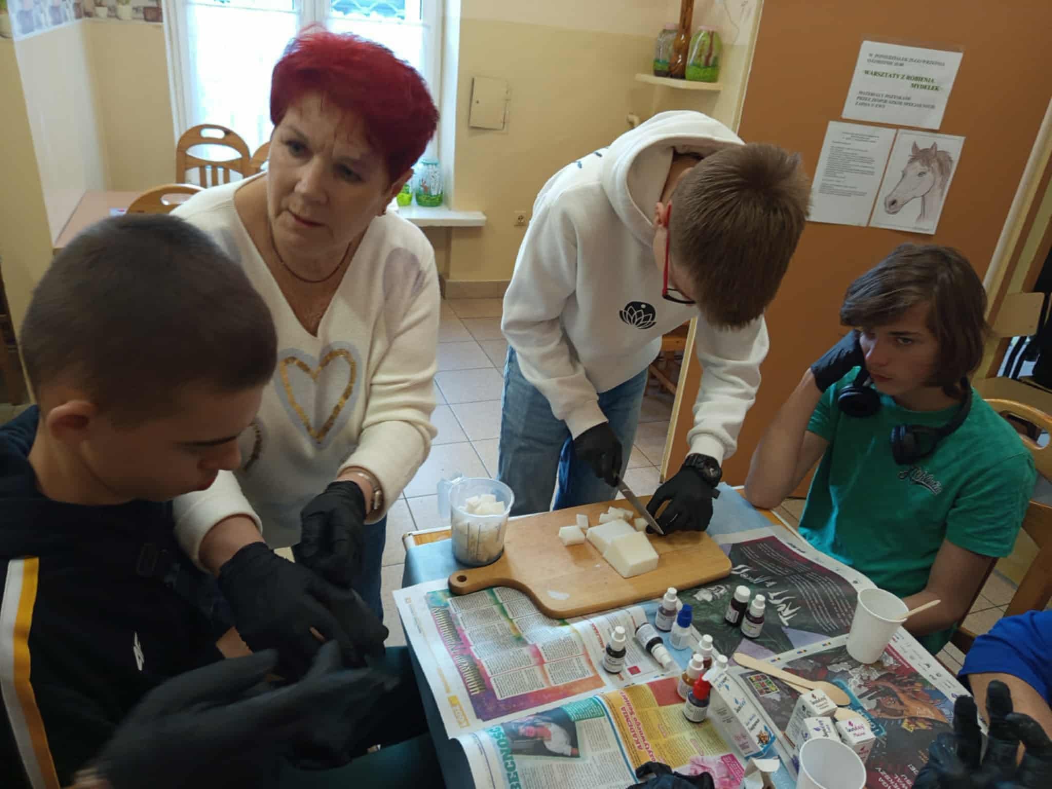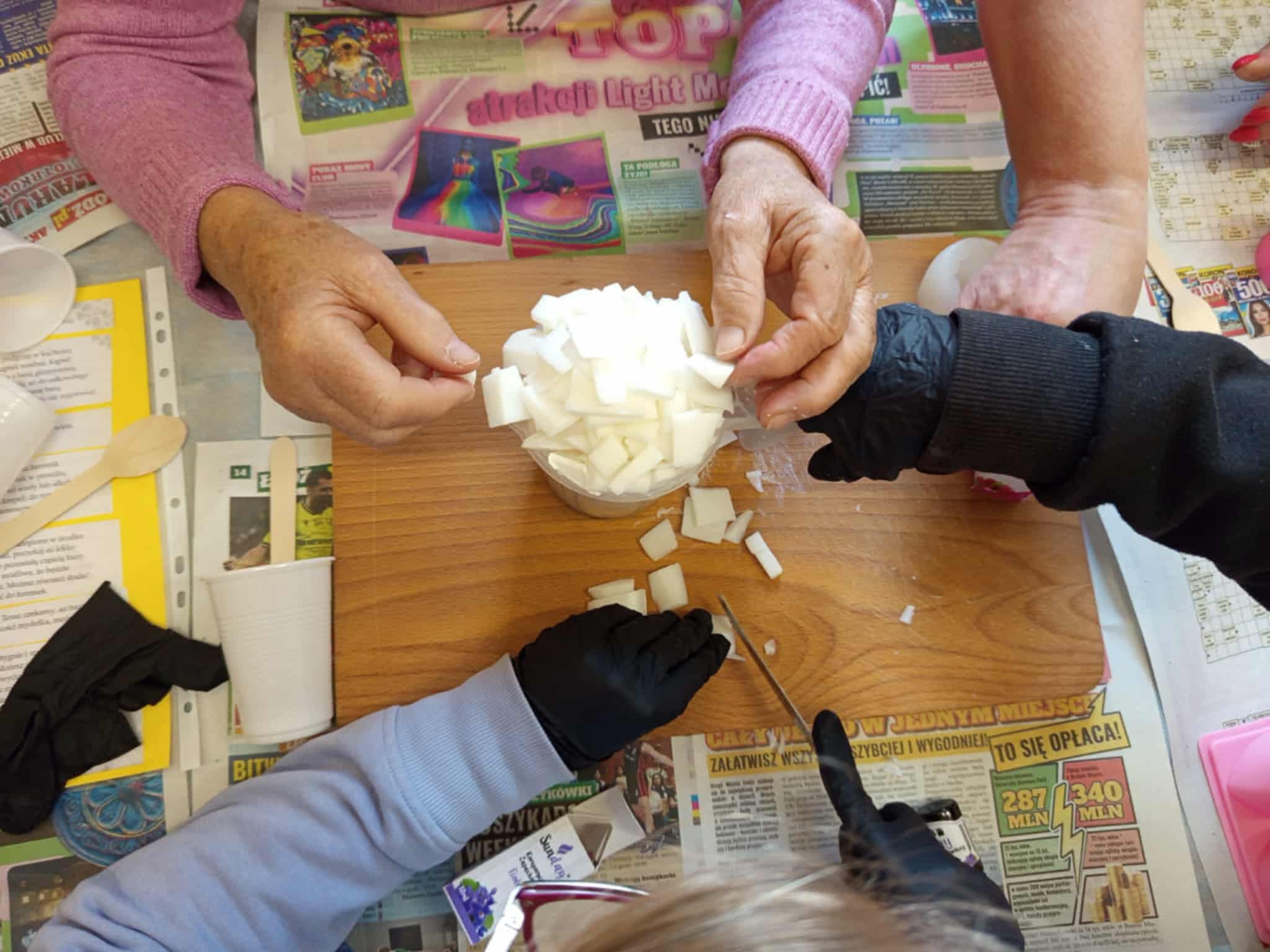 Młodzież udała się do Domu Dziennego Pobytu przy ul. 1 Maja w Łodzi. Spotkanie z seniorami miało na celu: nawiązanie współpracy międzypokoleniowej, rozwijanie empatii i wrażliwości oraz… nabycie nowych umiejętności rękodzielniczych. Uczniowie nie tylko zacieśnili więź z podopiecznymi placówki, ale również nauczyli się robić pachnące mydełka glicerynowe.