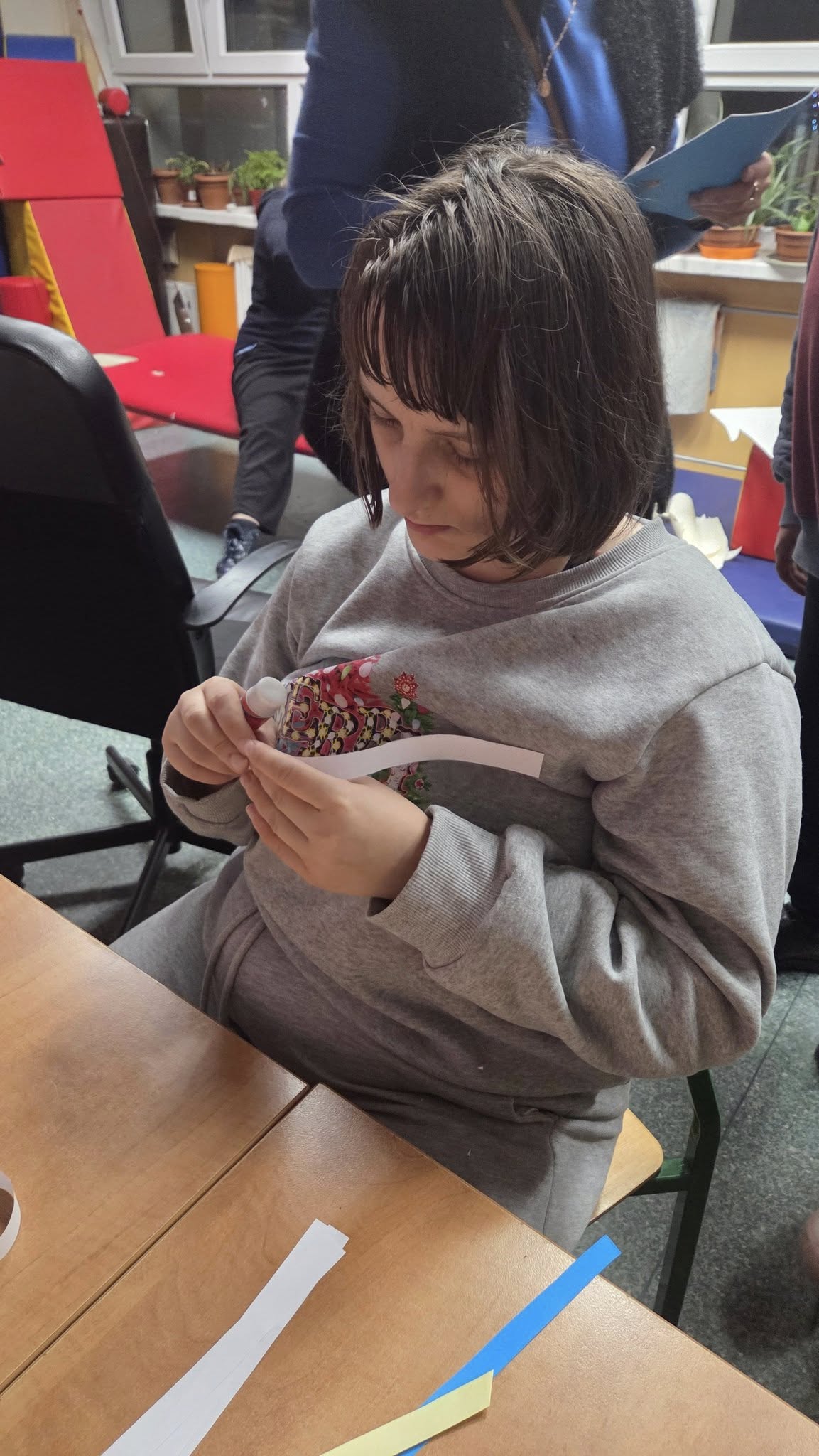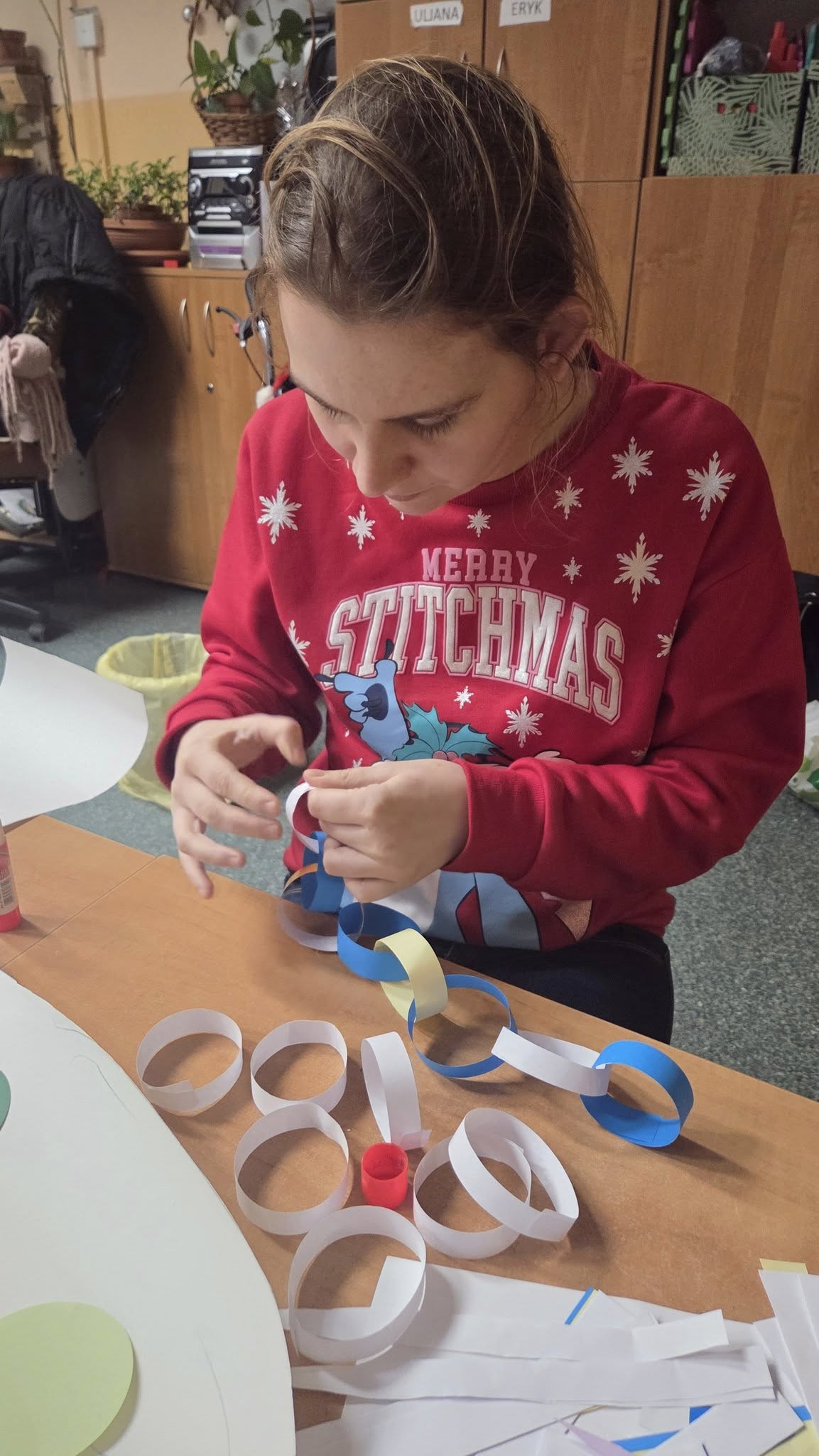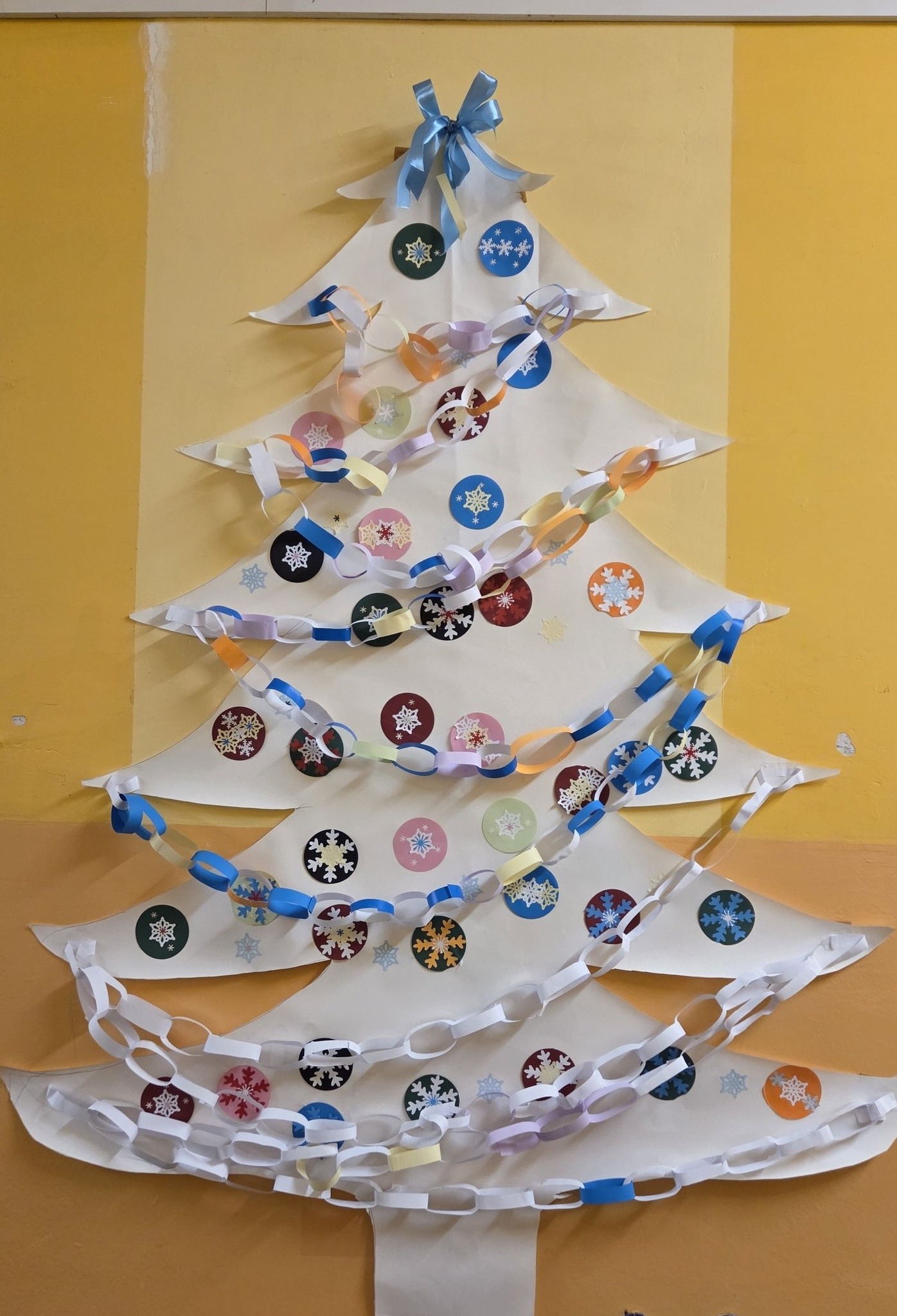 Spędziliśmy czas przy pysznych ciastkach i aromatycznej herbacie, w serdecznej, ciepłej atmosferze. Wykonaliśmy również piękną choinkę - pełną kolorów i świątecznych ozdób, która już teraz zdobi szkolny korytarz, wprowadzając wszystkich w bożonarodzeniowy nastrój.