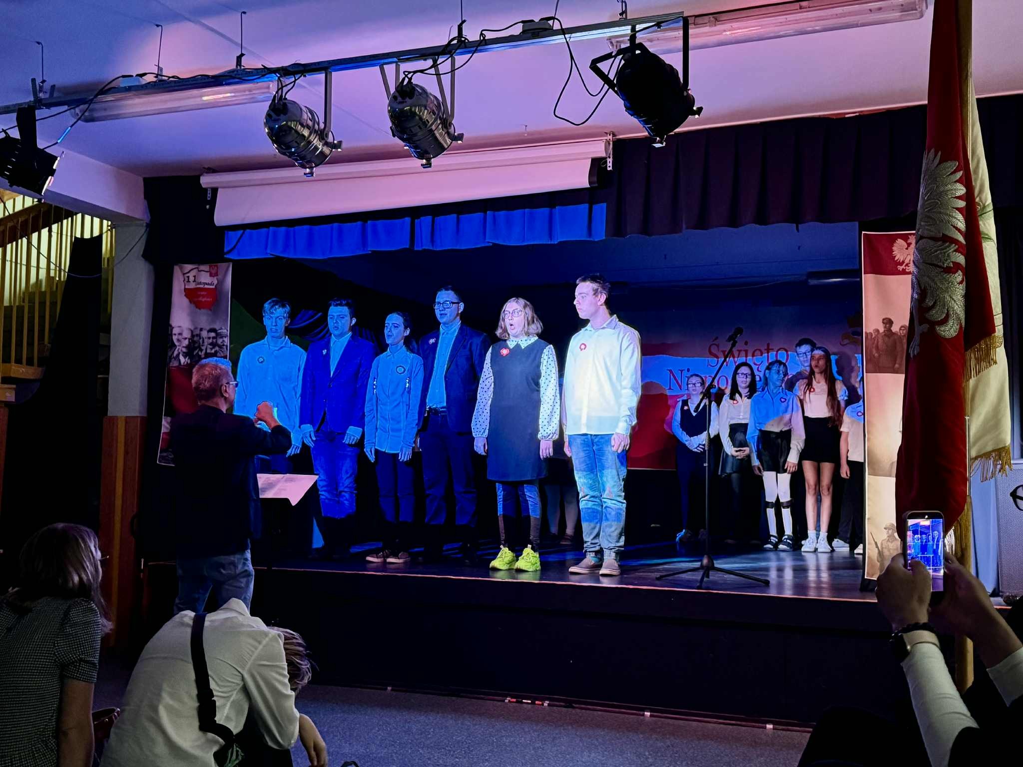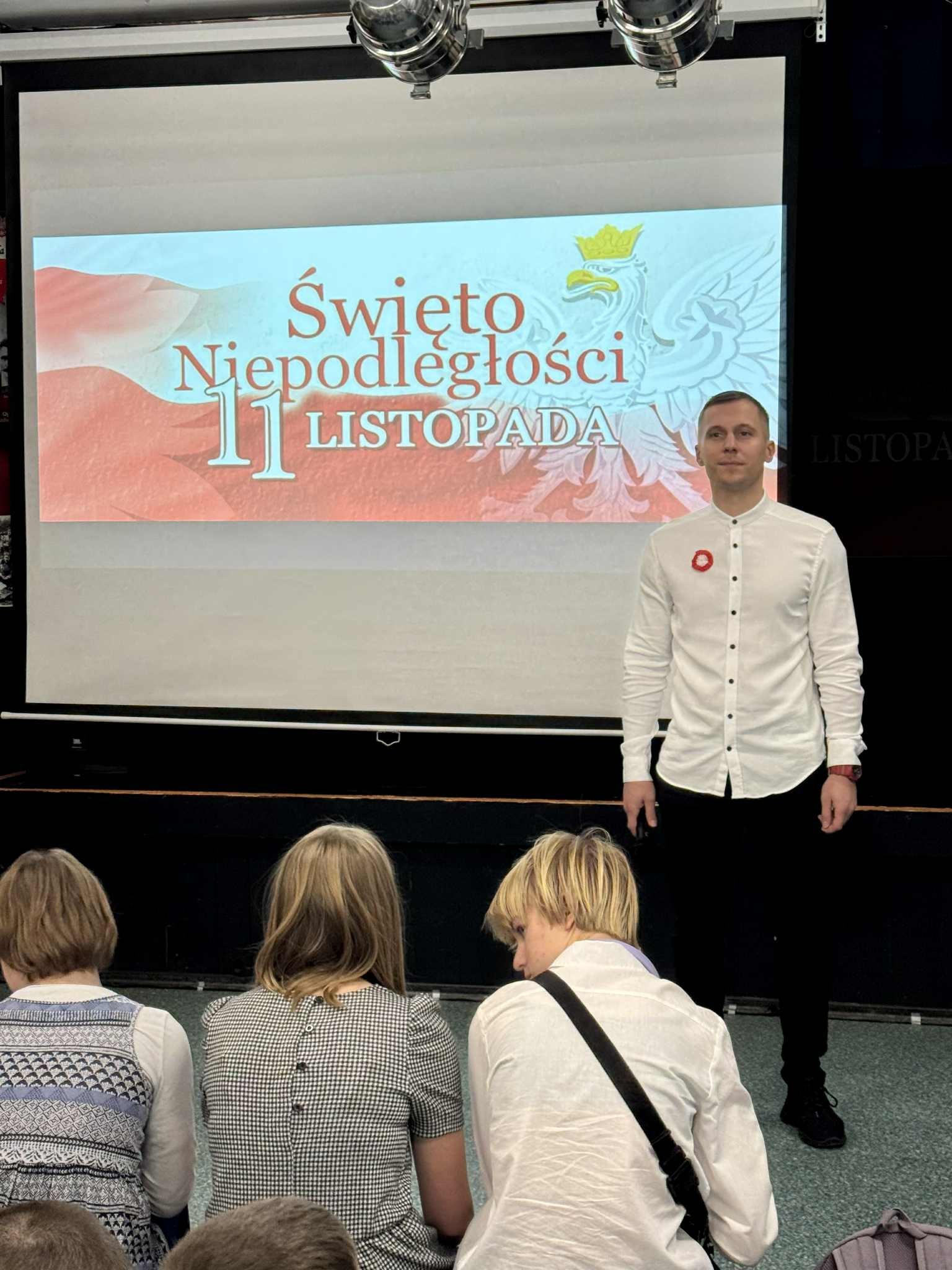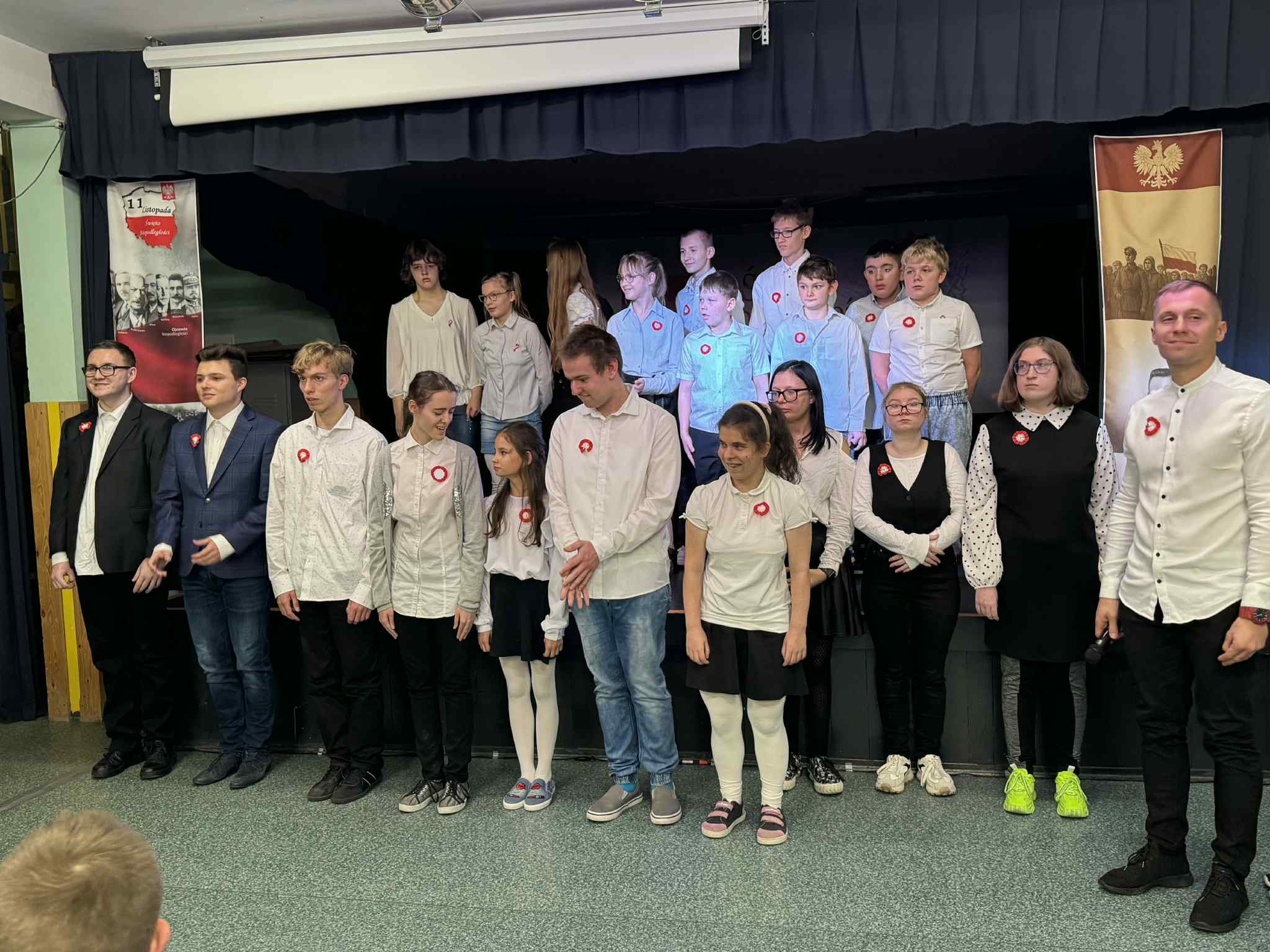 W poniedziałek mieliśmy drugą odsłonę szkolnych obchodów Narodowego Święta Niepodległości - uroczysty apel. Odświętnie ubrani uczniowie zgromadzili się pod sceną, aby obejrzeć przedstawienie muzyczno-poetyckie w wykonaniu swoich kolegów.