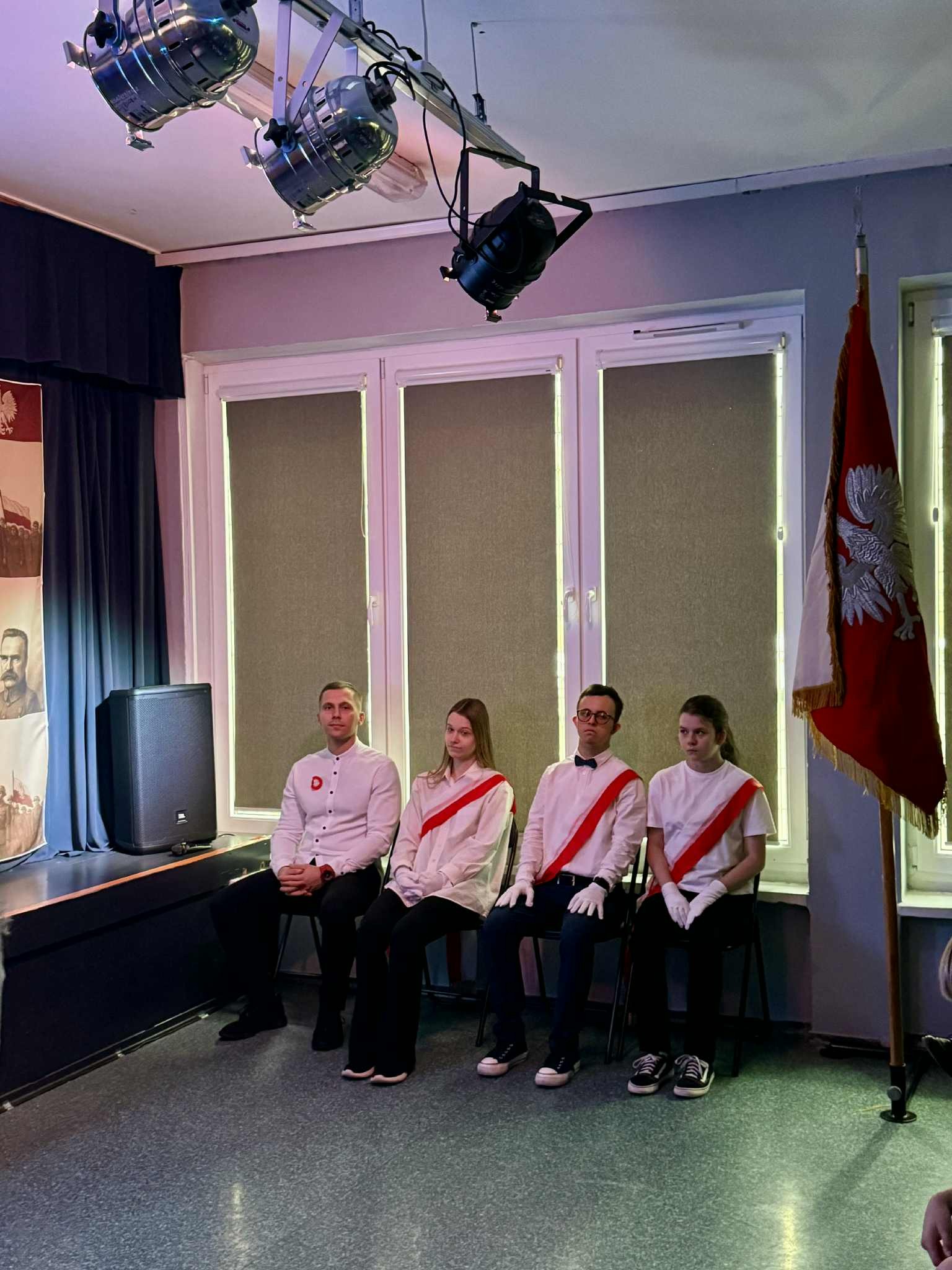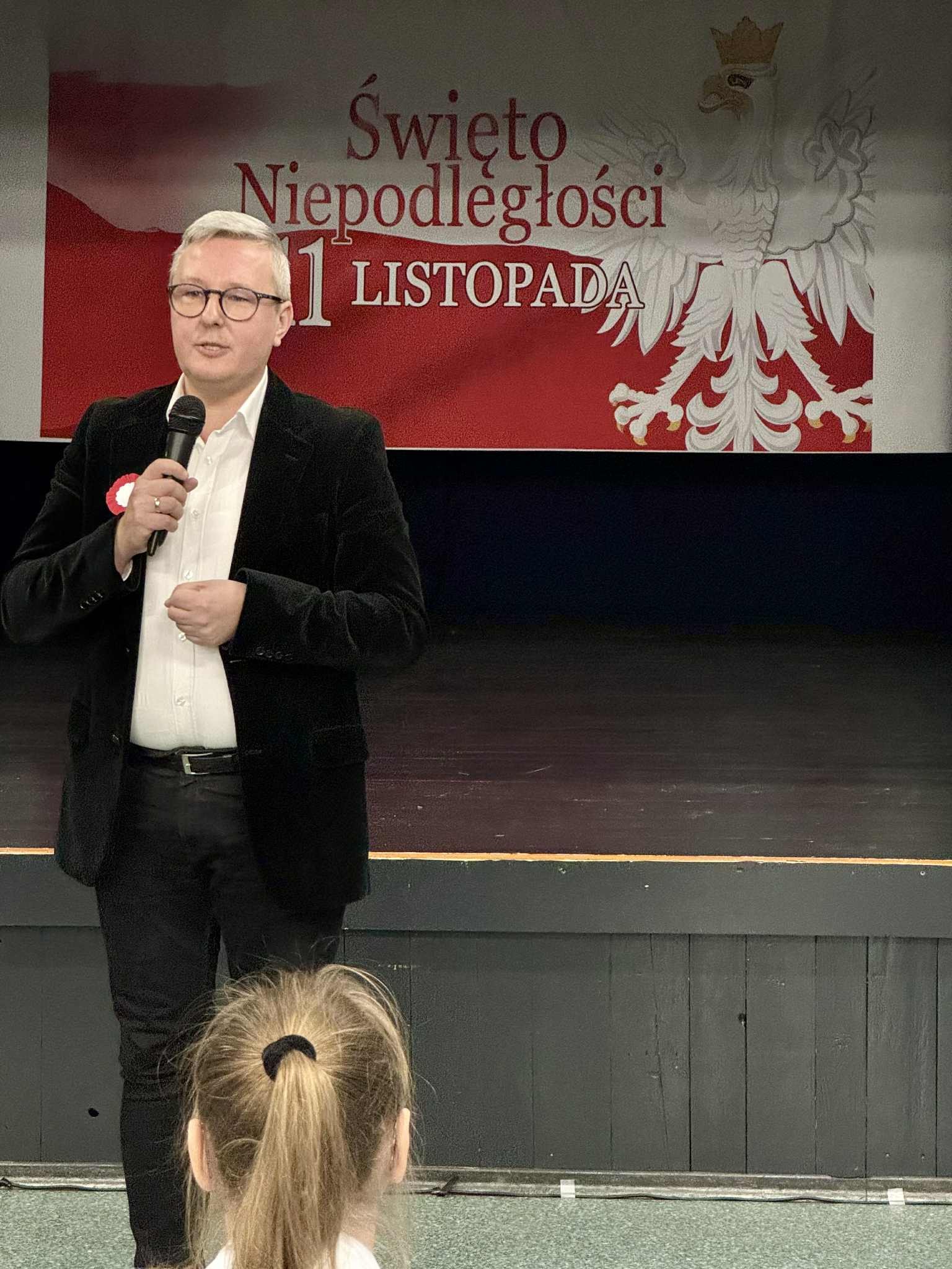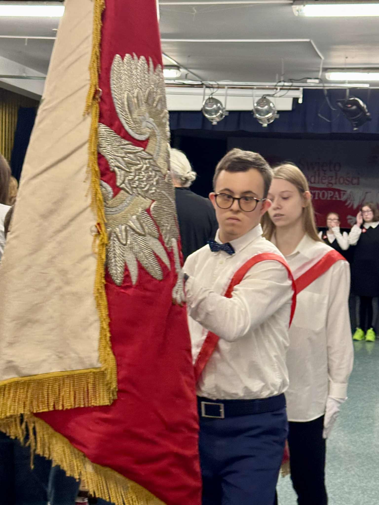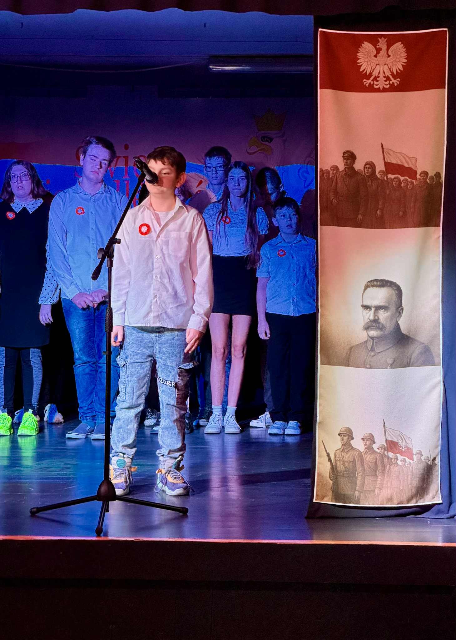W poniedziałek mieliśmy drugą odsłonę szkolnych obchodów Narodowego Święta Niepodległości - uroczysty apel. Odświętnie ubrani uczniowie zgromadzili się pod sceną, aby obejrzeć przedstawienie muzyczno-poetyckie w wykonaniu swoich kolegów.
