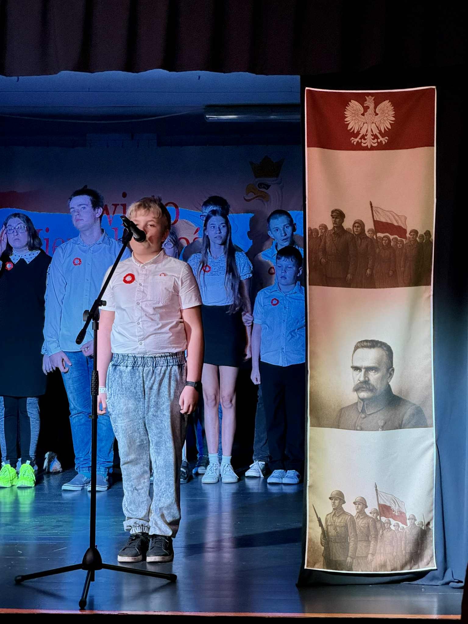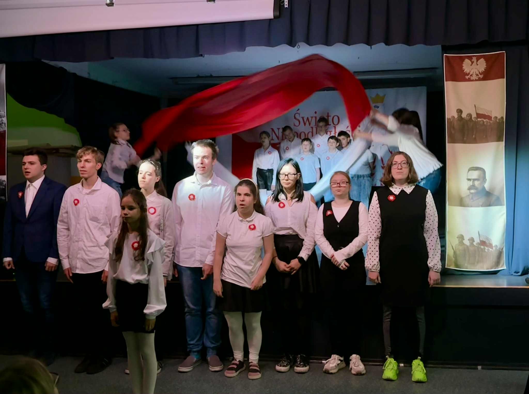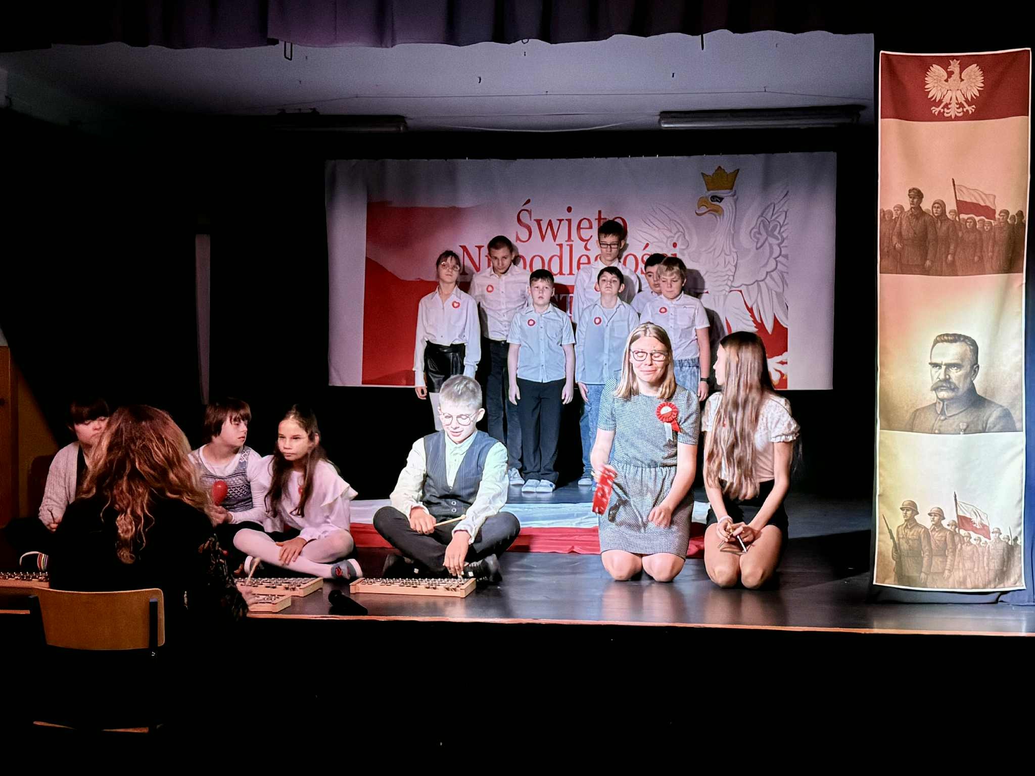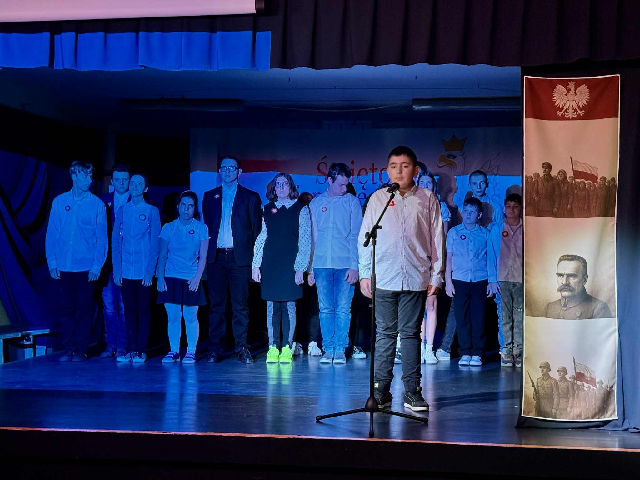 Inscenizację rozpoczęła prezentacja multimedialna w przystępny sposób wyjaśniająca genezę święta i jego sens. Następnie uczniowie recytowali pieśni patriotyczne oraz prezentowali znane i lubiane przez wszystkich pieśni legionowe (do śpiewania dołączała też widownia). Niespodzianką był występ kilkorga naszych podopiecznych przygotowany przez panią Magdalenę Prokop - gra na cymbałkach do piosenki "Jaki piękny kraj". Uwagę wszystkich przykuła również pięknie udekorowana scena - dzieło pani Anety Zientarskiej.