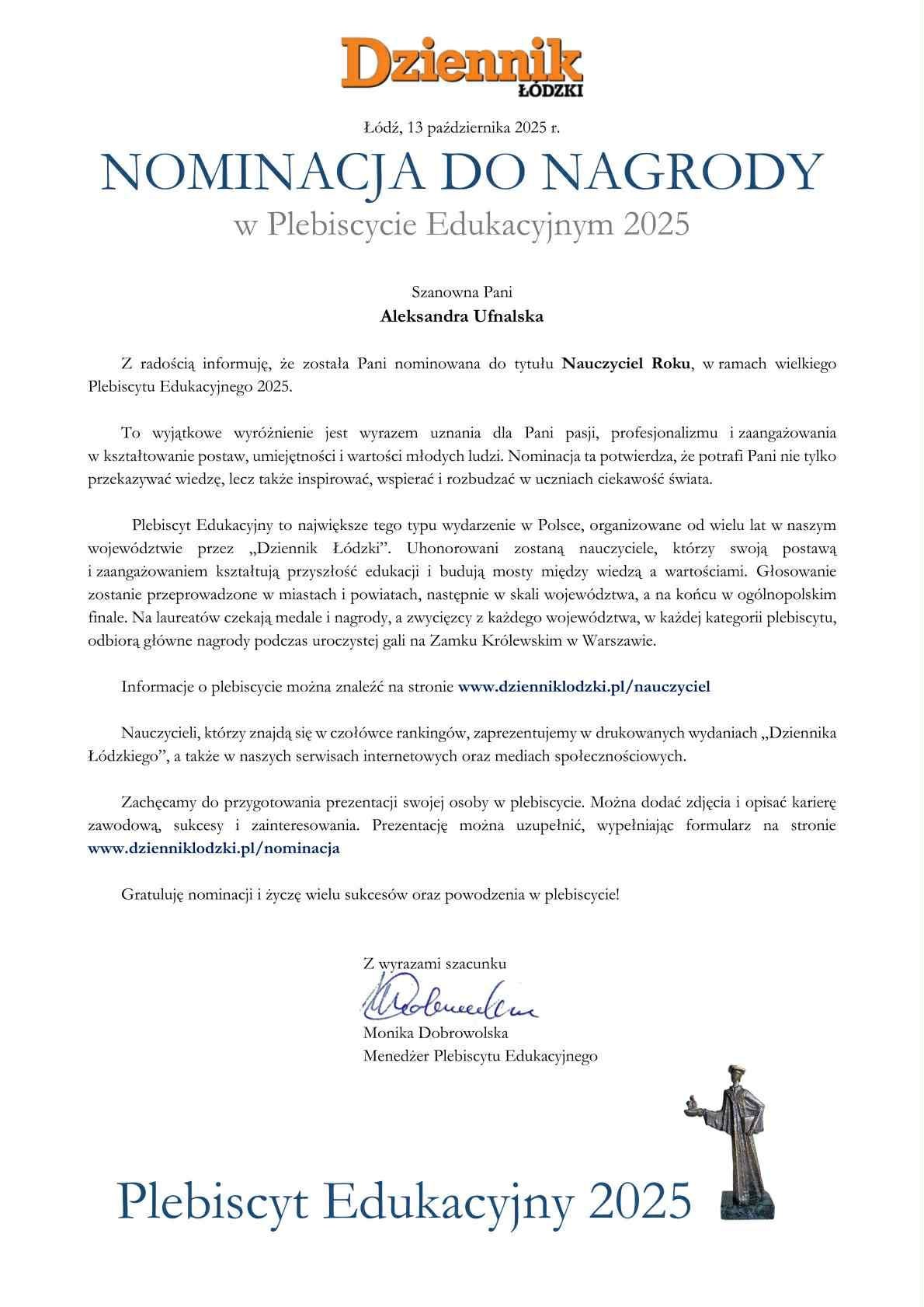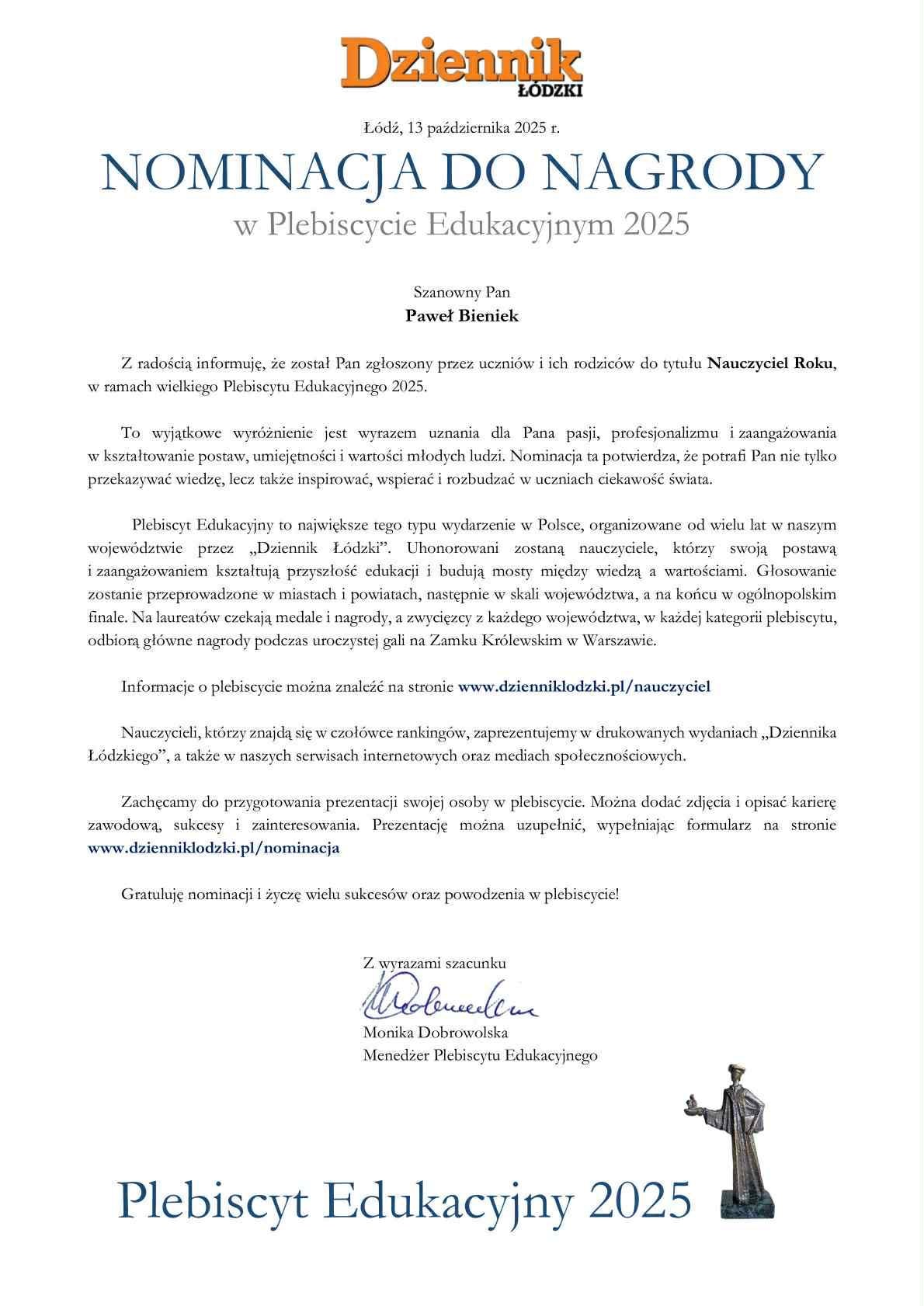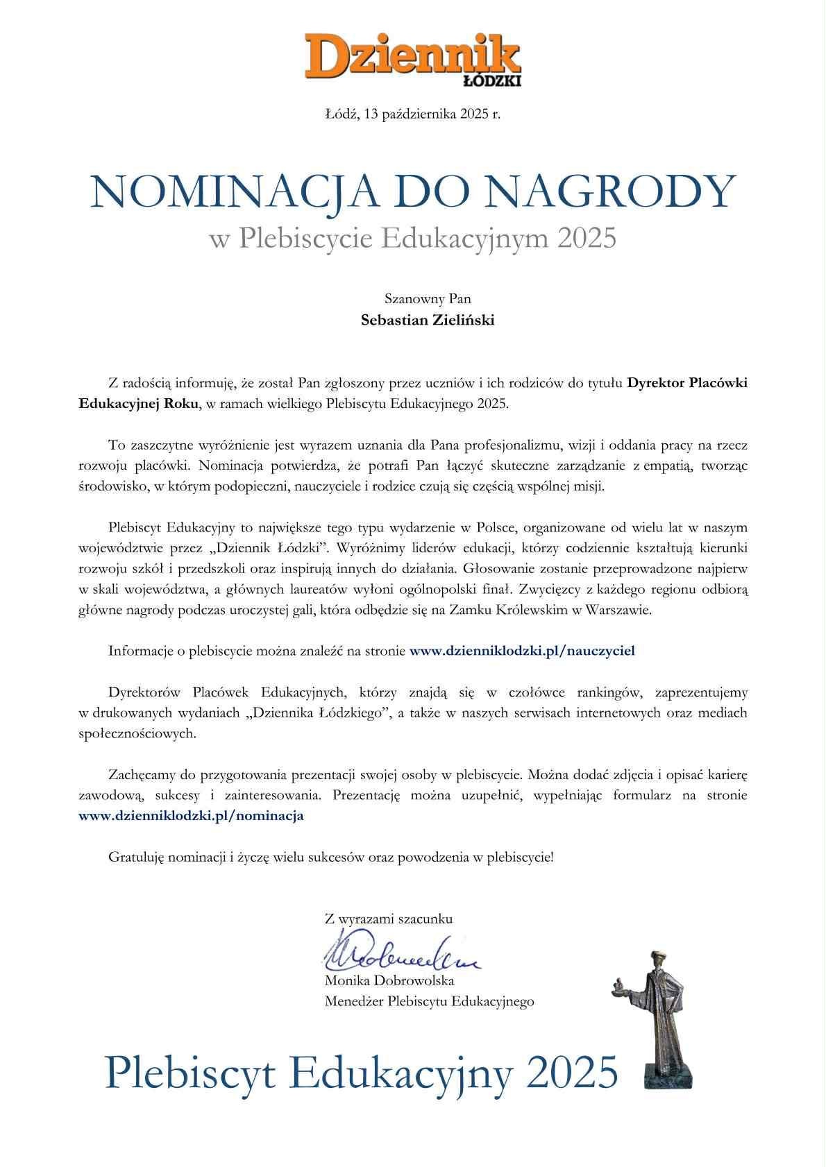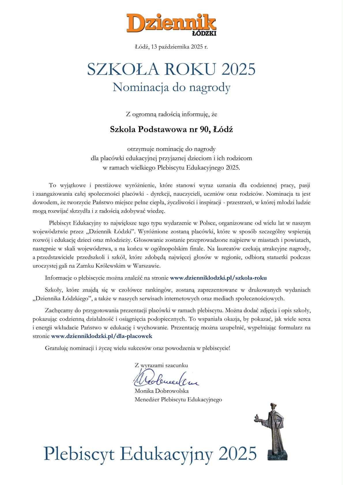 Miło nam poinformować, że nasza szkoła otrzymała nominację w plebiscycie Szkoła Roku 2025.
