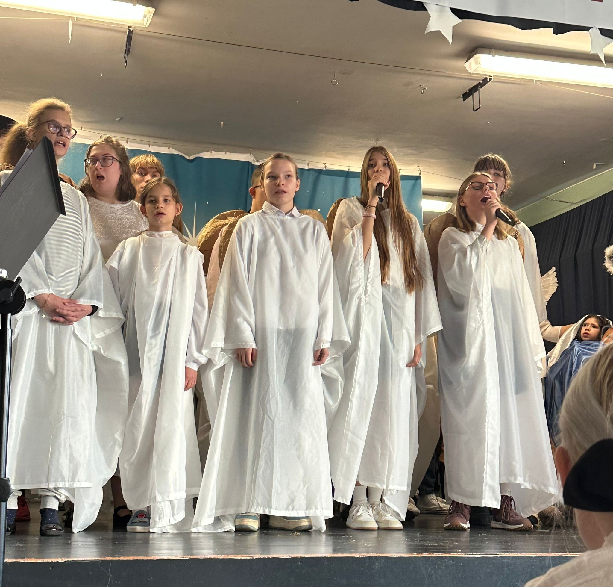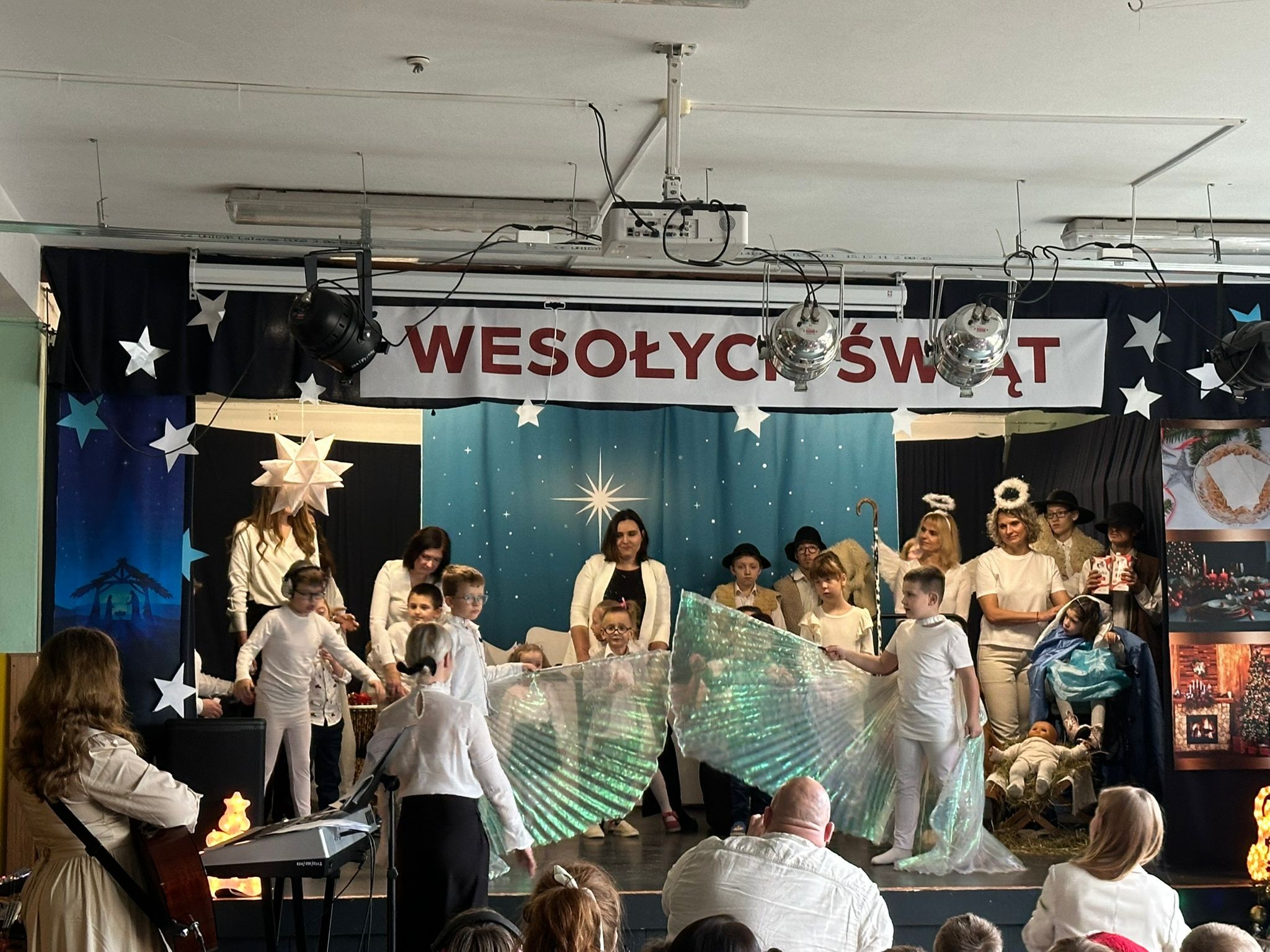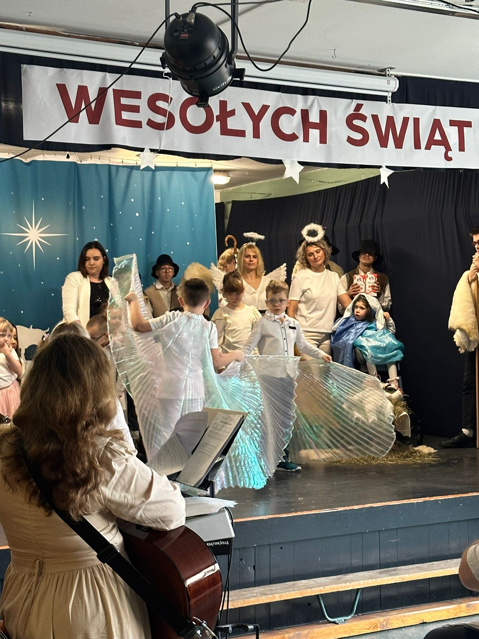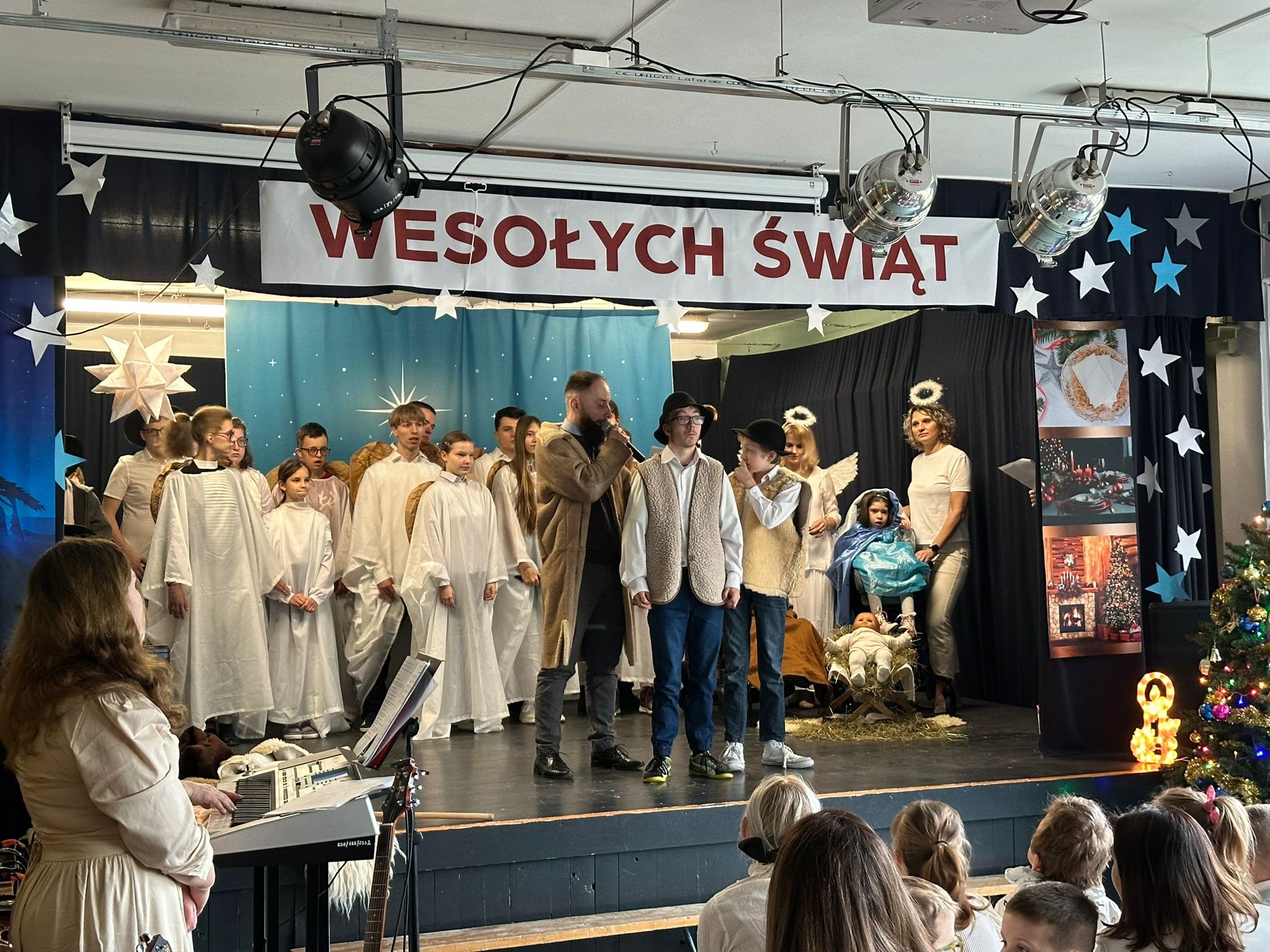 Pięknie udekorowana scena, wymyślne kostiumy, muzyka na żywo – to wszystko robiło wrażenie. Ksiądz Maciej odczytał stosowny fragment Biblii, po czym twórcy jasełek zaprosili widzów na wspólne kolędowanie. Opowieści o narodzinach Jezusa towarzyszyły znane i lubiane kolędy i pastorałki zaśpiewane przez panią Julię Jurczak wspólnie z chórem uczniów. Do przedstawienia dołączyły również przedszkolaki, które zaprezentowały układ rytmiczny.
