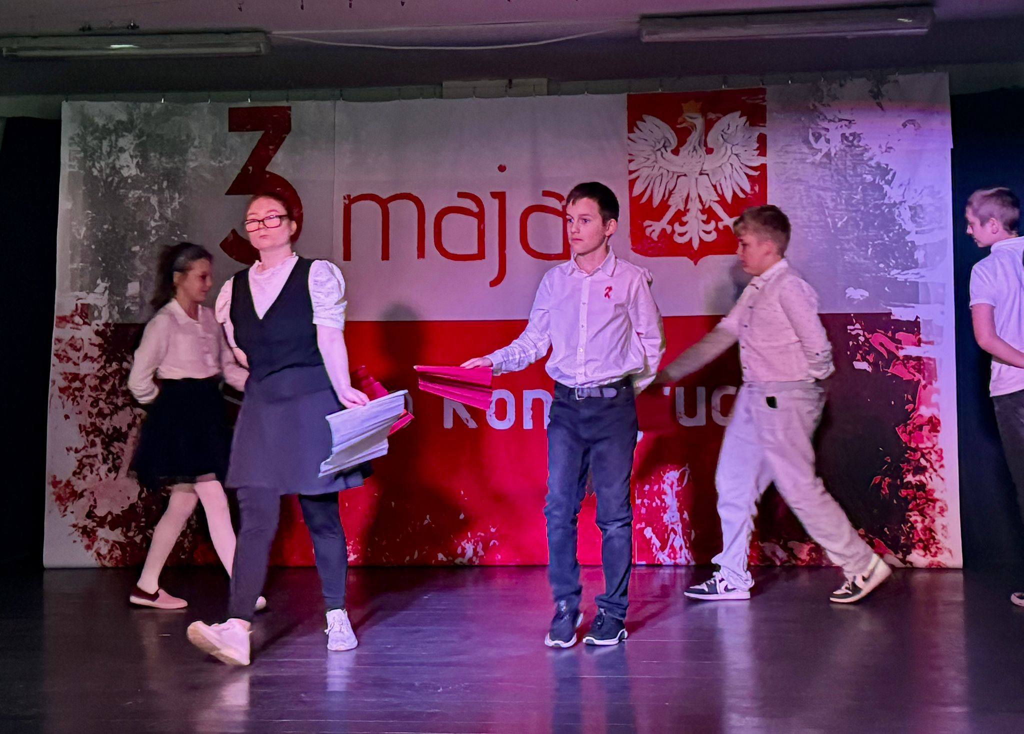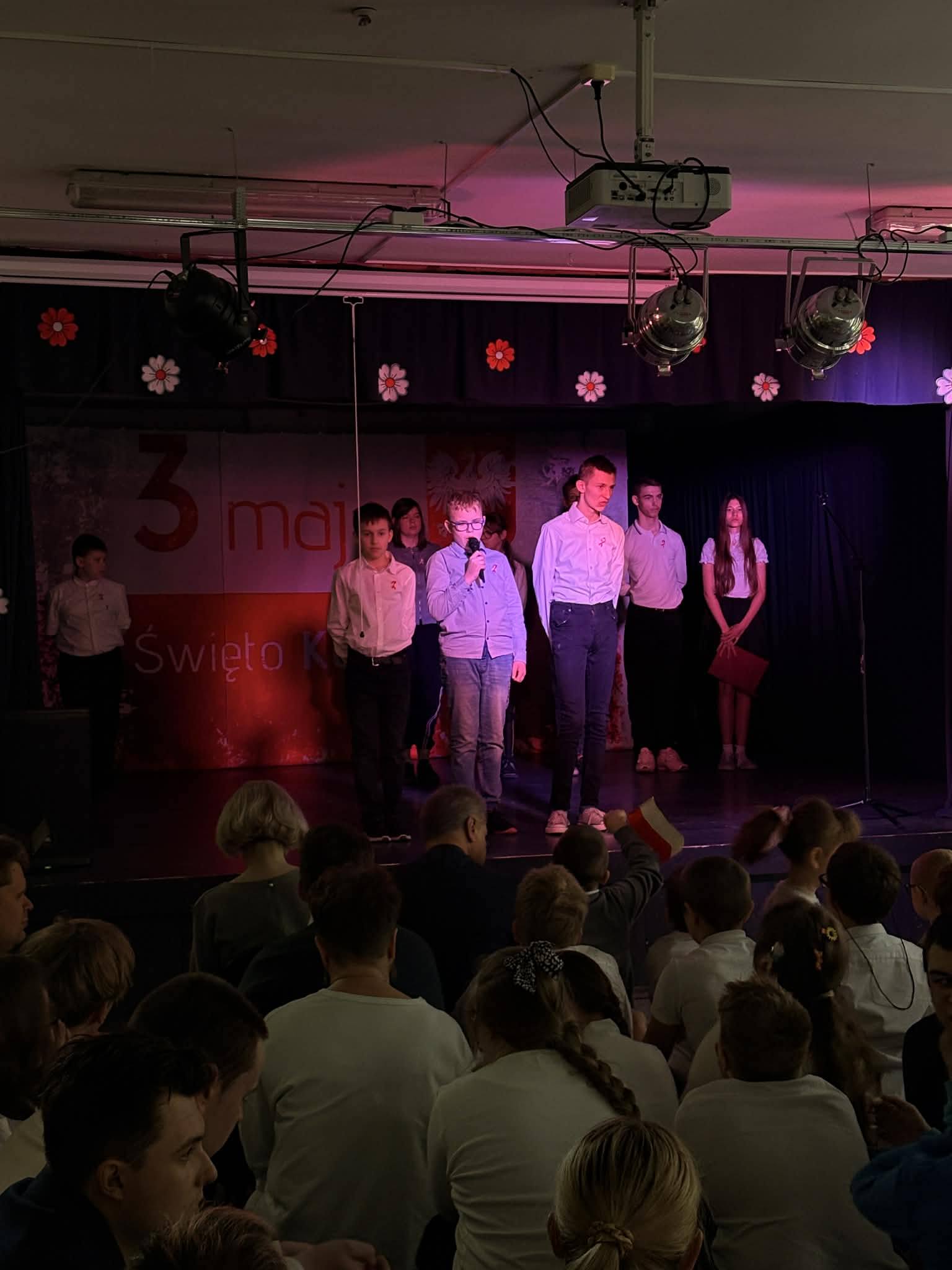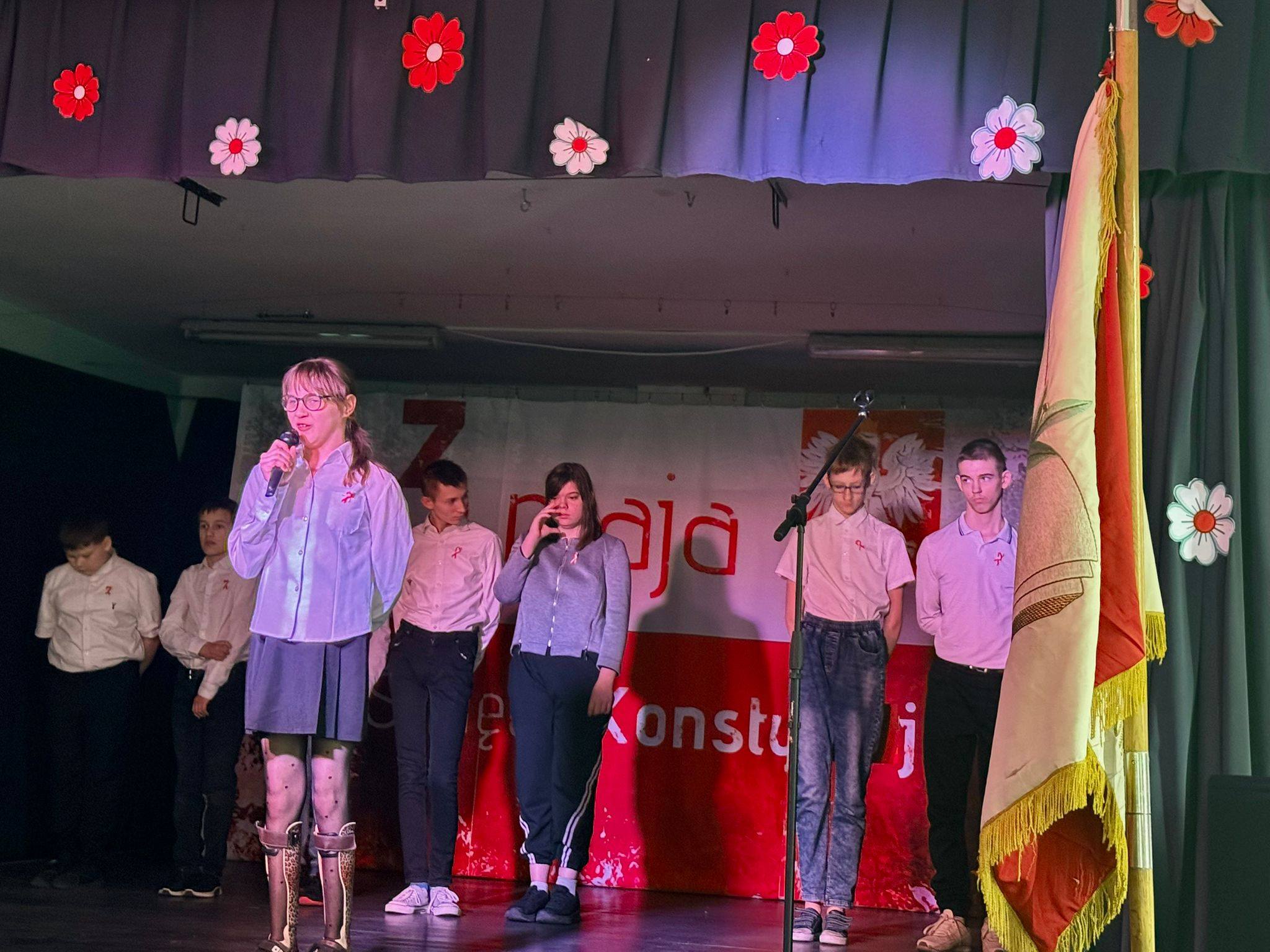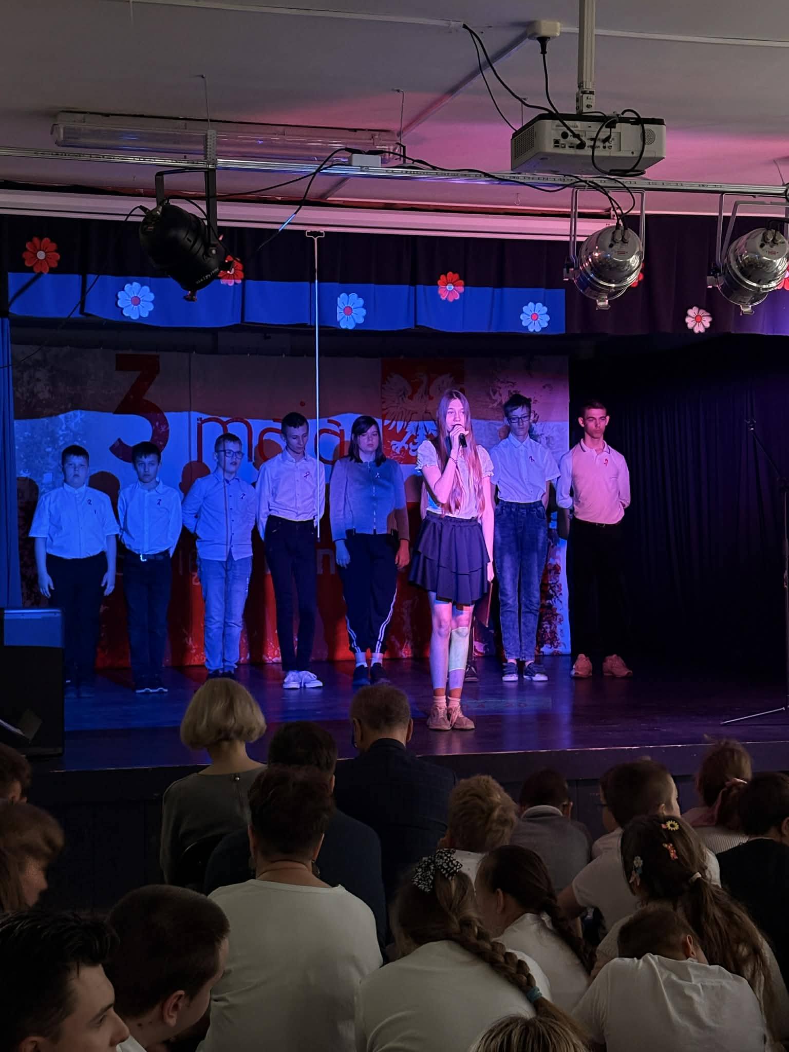 Po oficjalnej części (wprowadzenie sztandaru szkoły, odśpiewanie hymnu państwowego) nastąpiła część artystyczna – widowisko słowno - muzyczne. Publiczność obejrzała dwie prezentacje przypominające fakty historyczne związane z uchwaleniem Konstytucji 3 maja, wysłuchała recytacji wierszy oraz dwóch pieśni patriotycznych, podziwiała układ choreograficzny do melodii z filmu „Polskie drogi”. Nastrojowa muzyka oraz pięknie udekorowana scena współtworzyły podniosły, uroczysty nastrój występu.