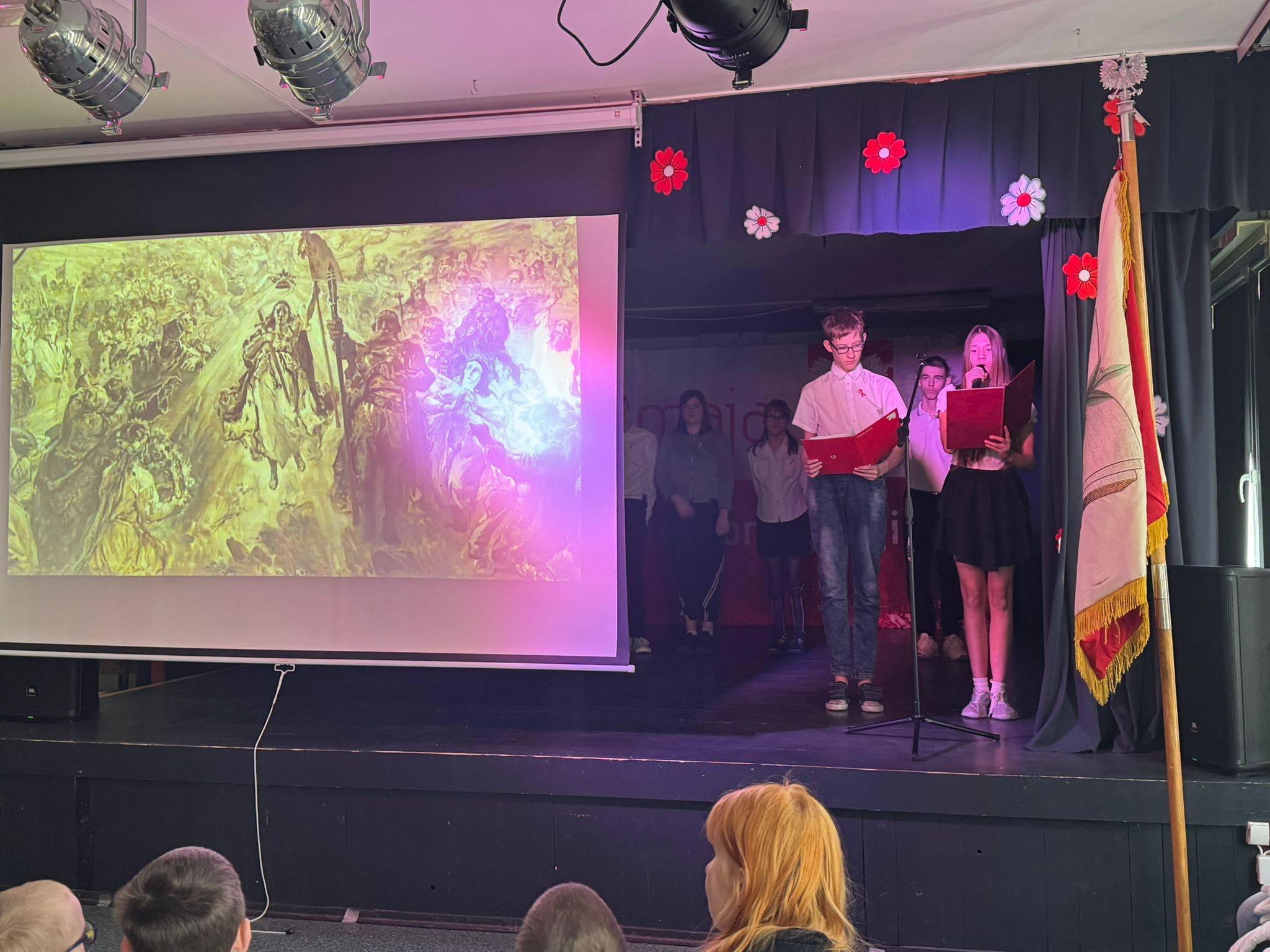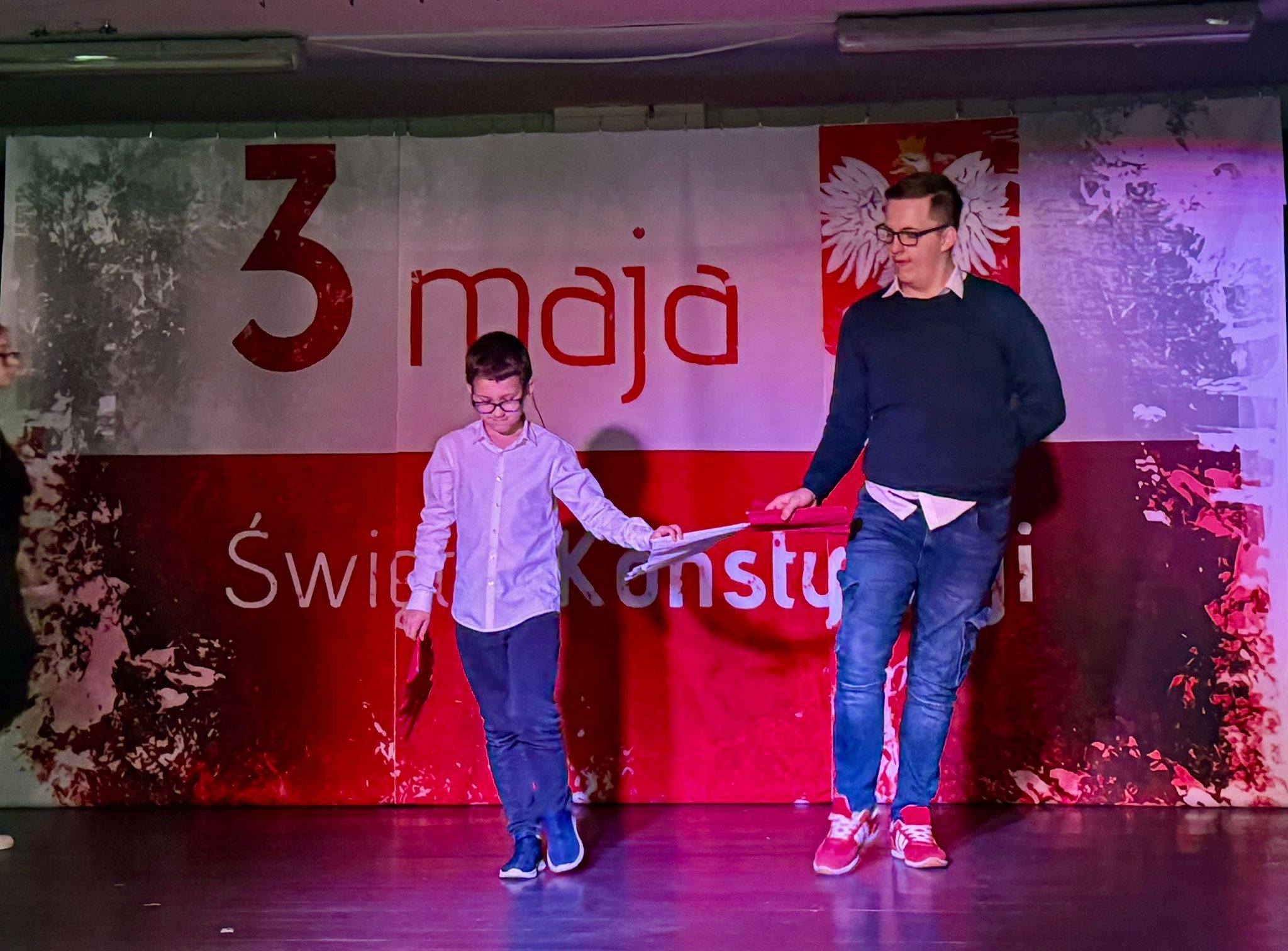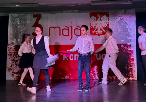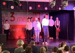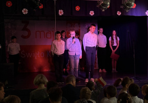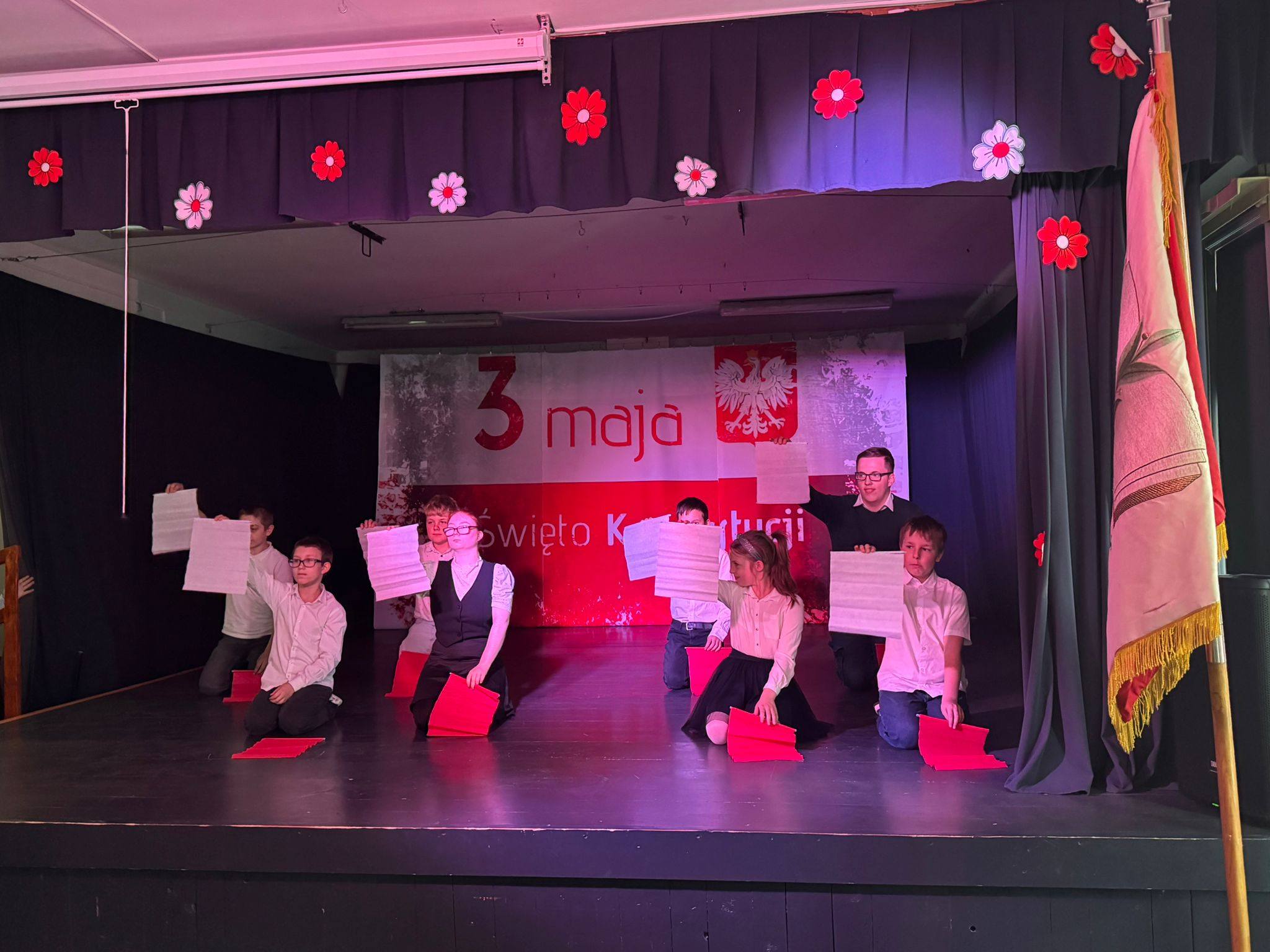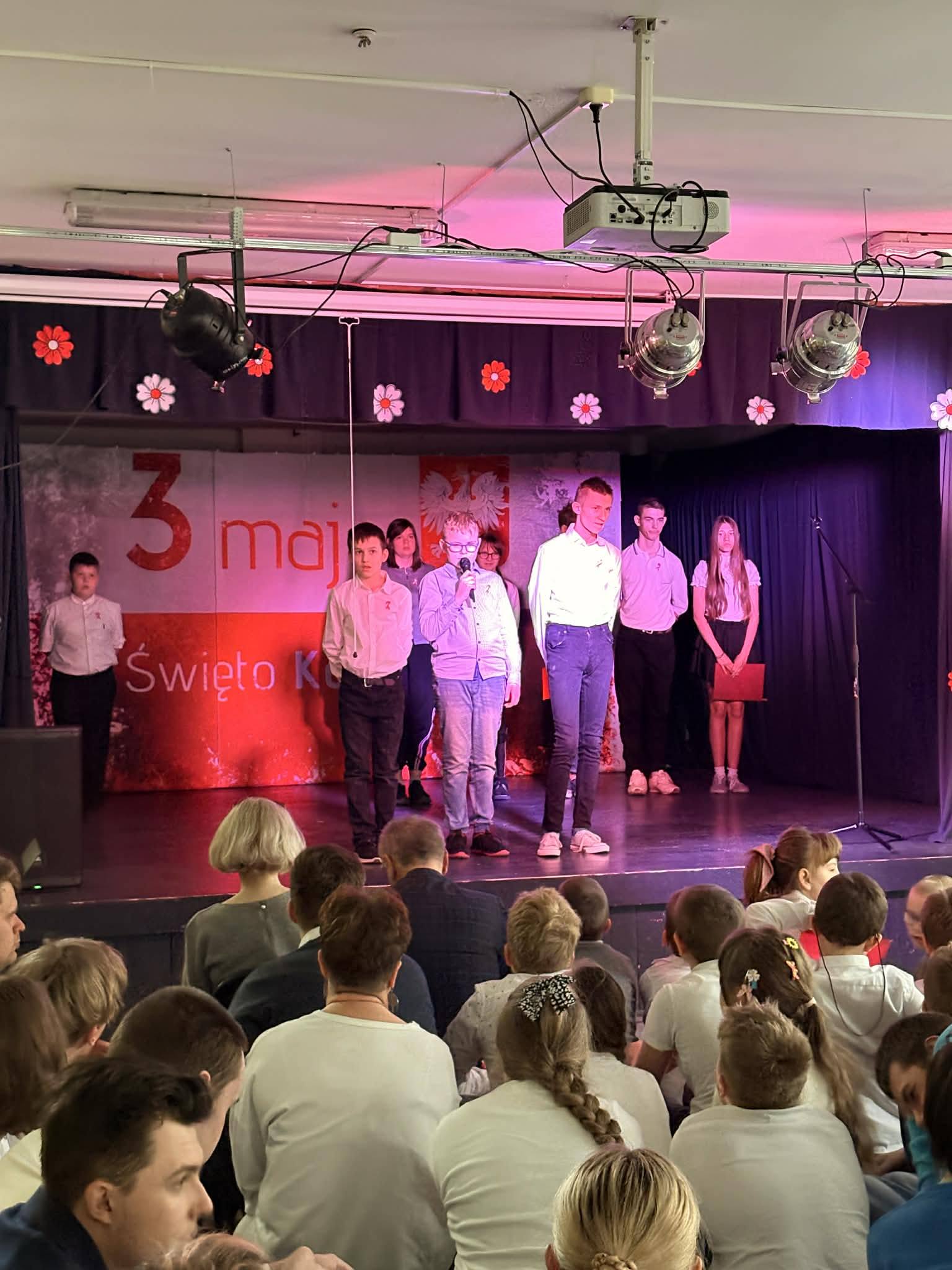 Po oficjalnej części (wprowadzenie sztandaru szkoły, odśpiewanie hymnu państwowego) nastąpiła część artystyczna – widowisko słowno - muzyczne. Publiczność obejrzała dwie prezentacje przypominające fakty historyczne związane z uchwaleniem Konstytucji 3 maja, wysłuchała recytacji wierszy oraz dwóch pieśni patriotycznych, podziwiała układ choreograficzny do melodii z filmu „Polskie drogi”. Nastrojowa muzyka oraz pięknie udekorowana scena współtworzyły podniosły, uroczysty nastrój występu.