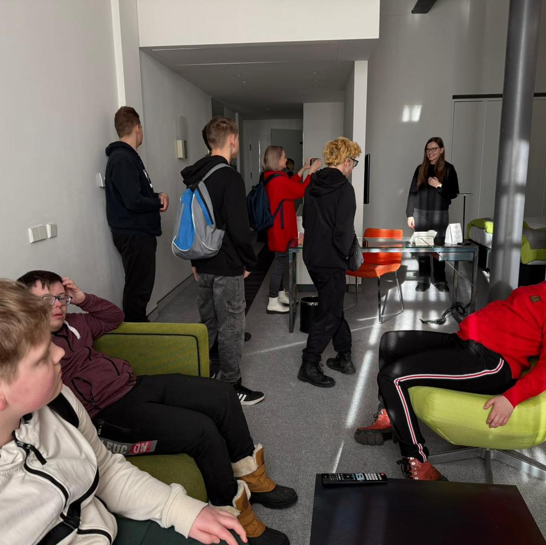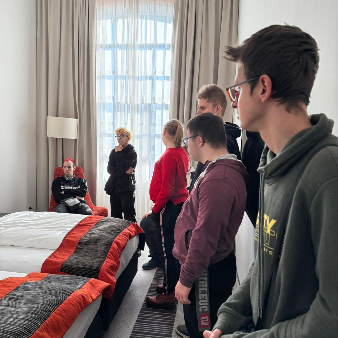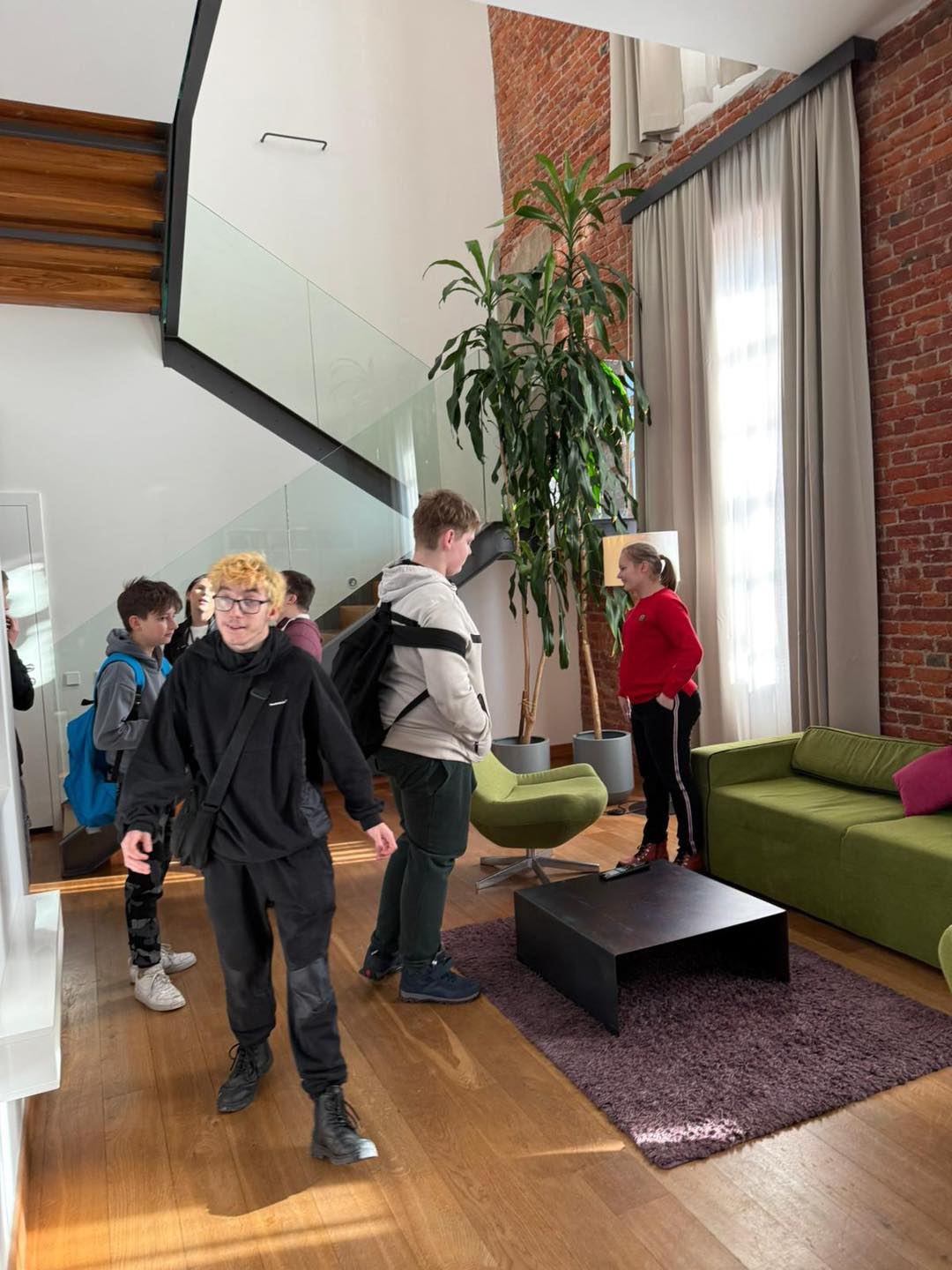 Zwiedzanie rozpoczęli od obejrzenia hallu i sal konferencyjnych na parterze. Duże wrażenie wywarła na nich sala satynowa ze względu na swój rozmiar oraz fakt, że z okna można podziwiać panoramę Manufaktury. Potem udali się na czwarte piętro, gdzie zobaczyli salę balową oraz interesujące wykończenie korytarzy z czasów fabryki włókienniczej. Zwiedzili pokoje hotelowe o różnym standardzie, obejrzeli ich wyposażenie, szafy, łazienki czy salony. Dotarli także do części relaksacyjnej, gdzie znajdują się sauna, fitness, skyroom. Uczniom umożliwiono otwieranie drzwi kartą magnetyczną, co okazało się nie lada wyzwaniem dla niektórych.