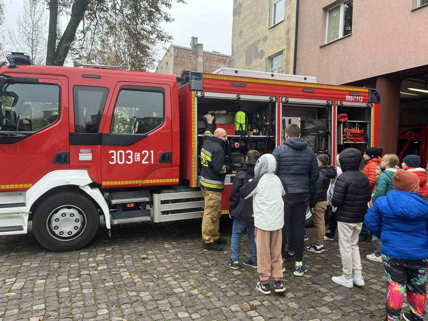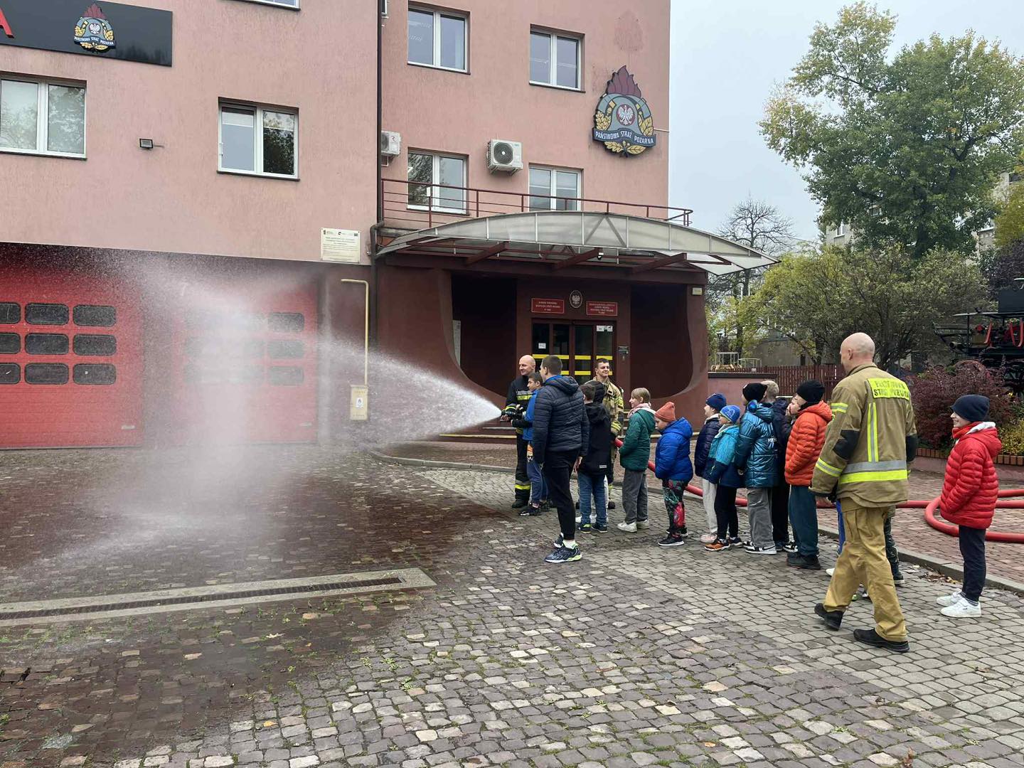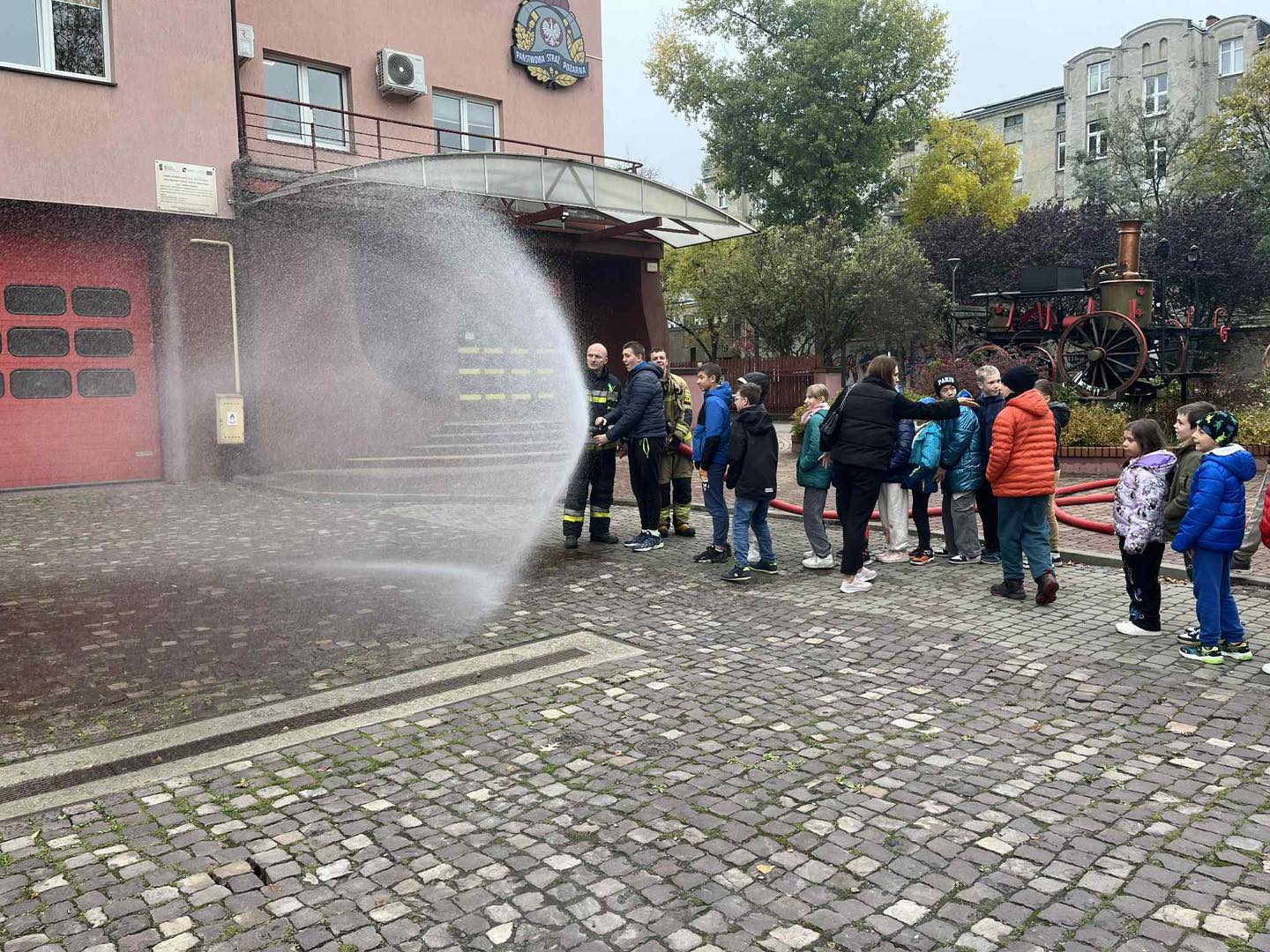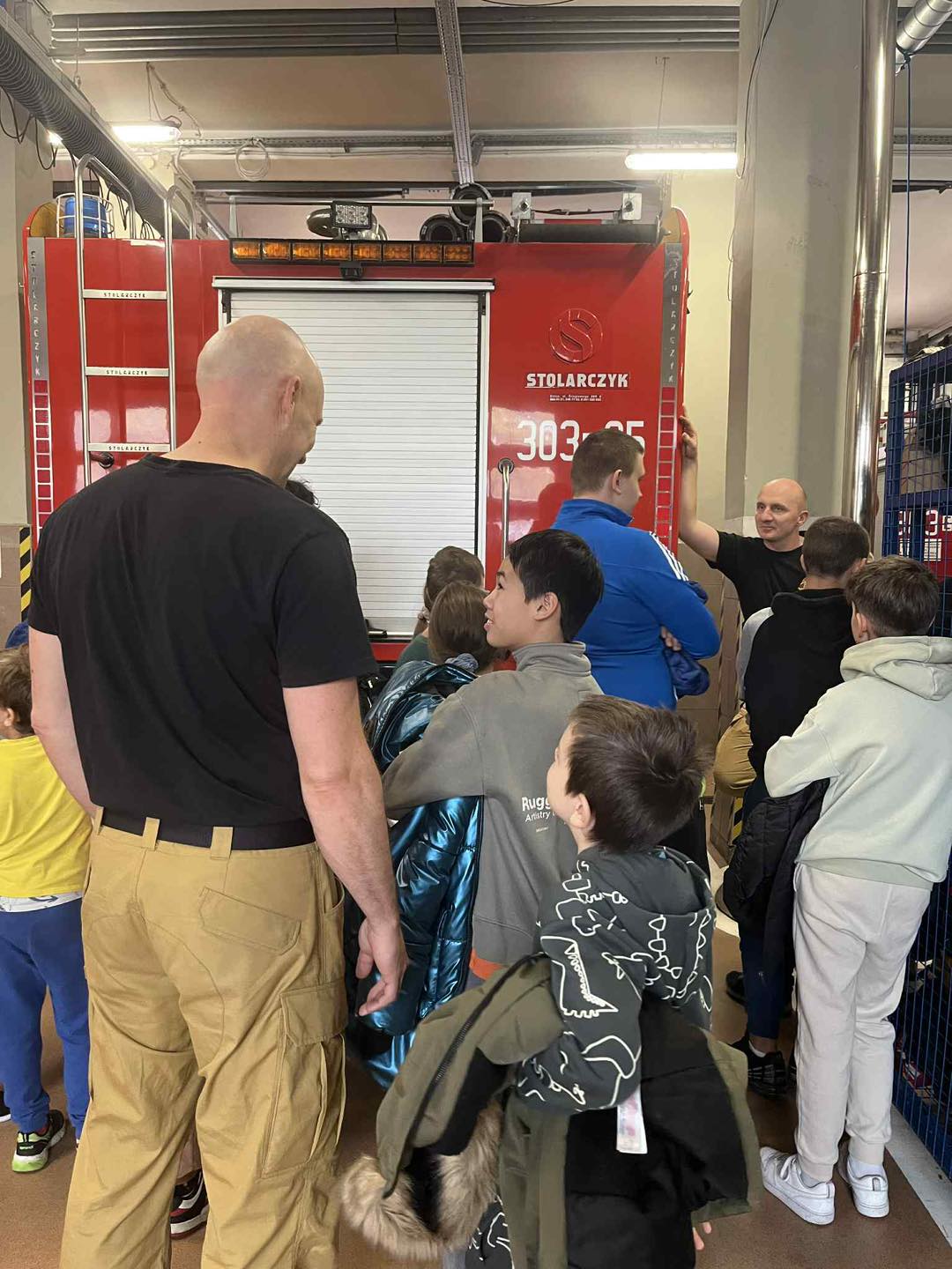 Pan aspirant opowiedział im o odpowiedzialnej i pełnej poświęcenia pracy strażaka, o wykorzystywanym sprzęcie oraz akcjach ratowniczych. Uczniowie zwiedzili budynek straży, w tym: saunę, jadalnię czy pokój audiowizualny. Wszystkie pomieszczenia były bardzo interesujące, jednak największe wrażenie wywarł na nich garaż z wozami strażackimi. Wiele emocji wzbudził moment, gdy mogli sami polać wodę z prawdziwego strażackiego węża!